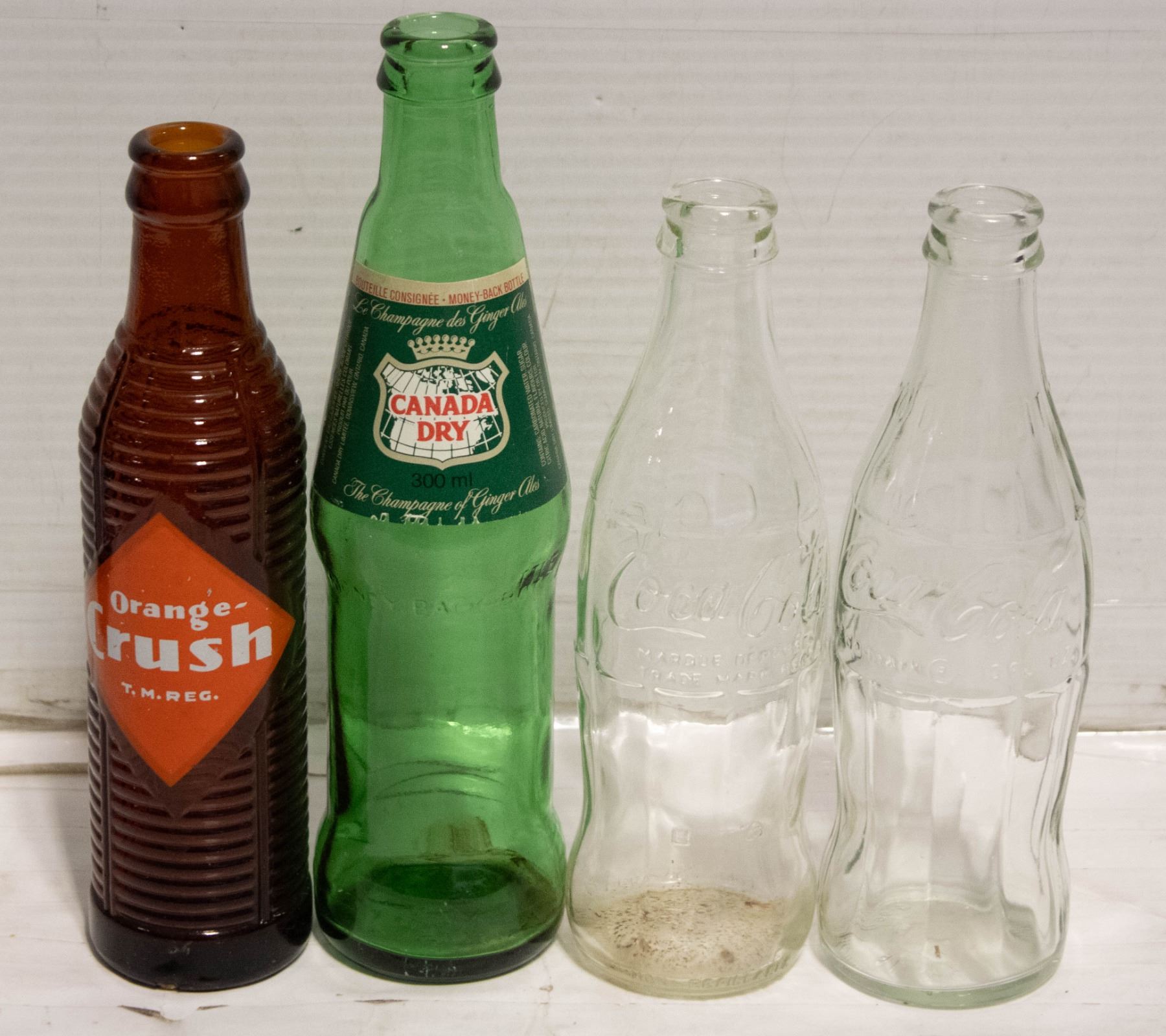 FOUR VINTAGE POP BOTTLES ORANGE CRUSH, COCACOLA,