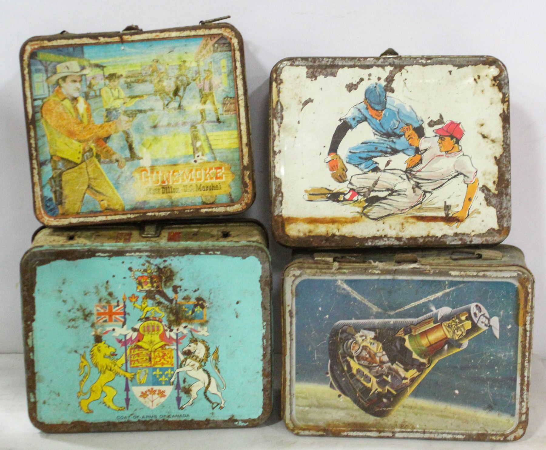 FOUR VINTAGE TIN LUNCH BOXES AS IS