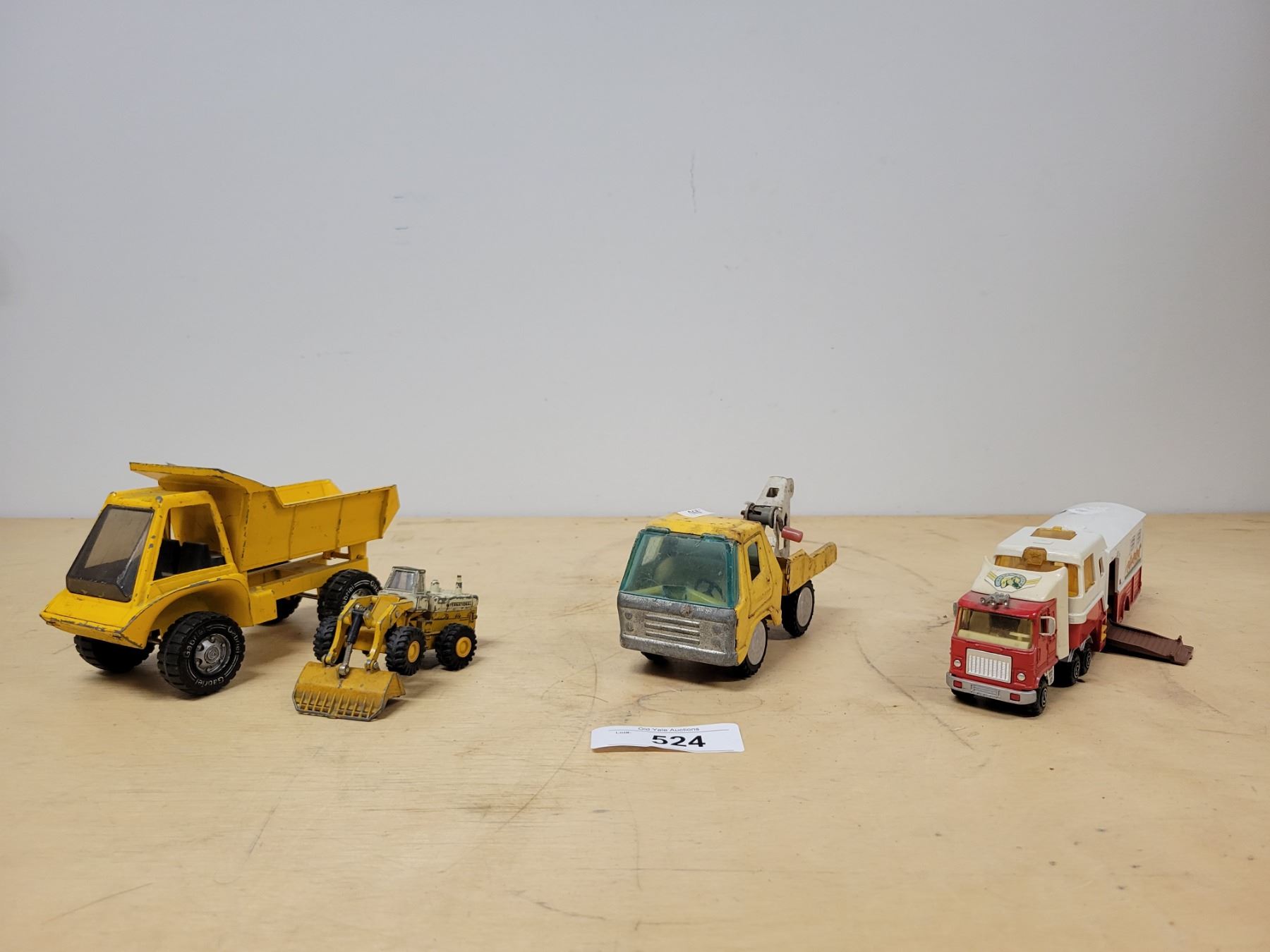 PRESSED STEEL DUMP TRUCK, TOW TRUCK, DIE CAST FRONT LOADER ETC