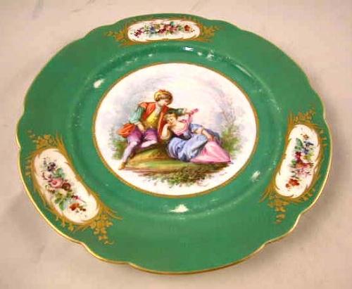 FOURTEEN SEVRES GREEN PICTORIAL PLATES; depicting couples in the center, losses