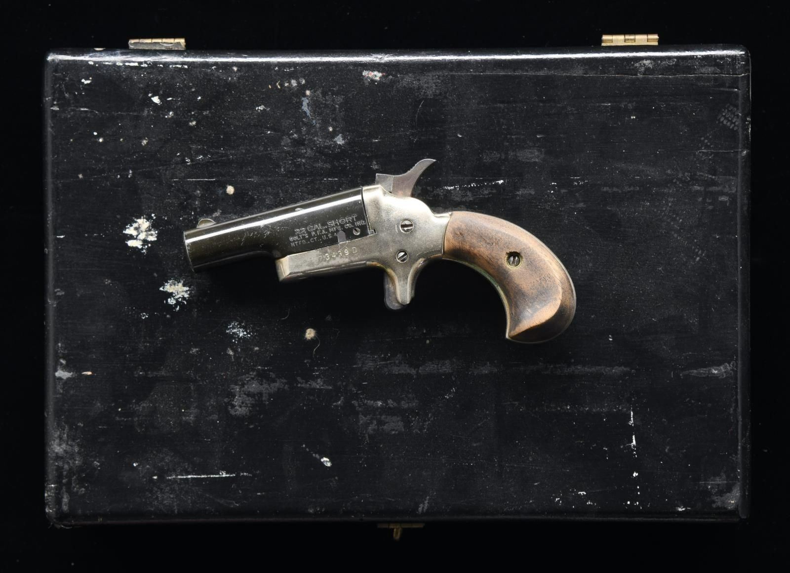 Cal. 22 Short. S# 73439D. Bbl. 2 1/2". Small round blade front sight. Mfg. 1959-63. Black chrome bbl. Silver plated frame. Hardwood grips. UNATTACHED ACCESSORIES: red lined case w/ black exterior & slots for two pistols in good condition. CONDITION: grips appear cleaned w/ some black staining & handling wear. Frame is turning to a light patina w/ scattered oxidation. Bbl. retains much of its finish w/ some dings, light flaking & scratches. Very good bore. (23-5077/MJC). CURIO. $200-300.