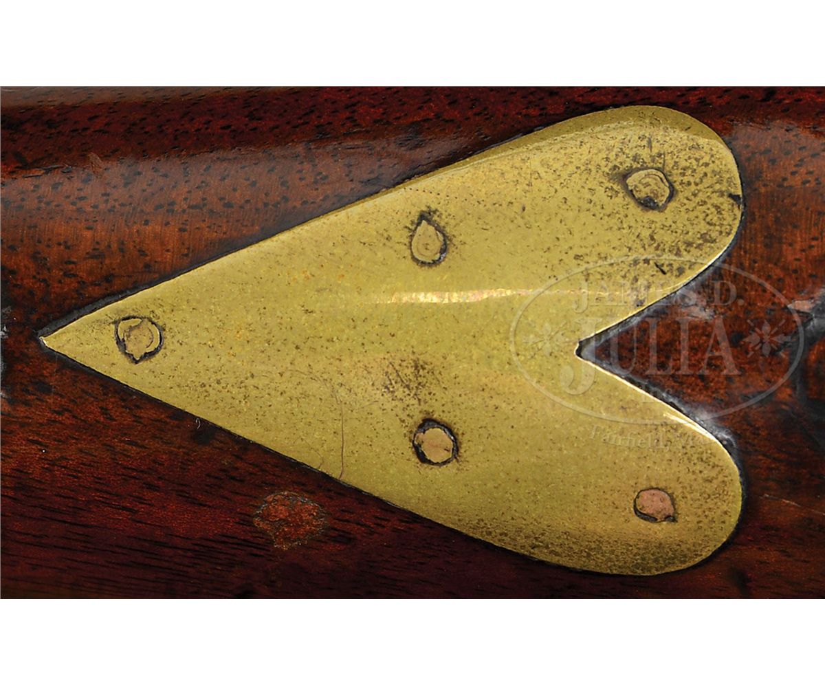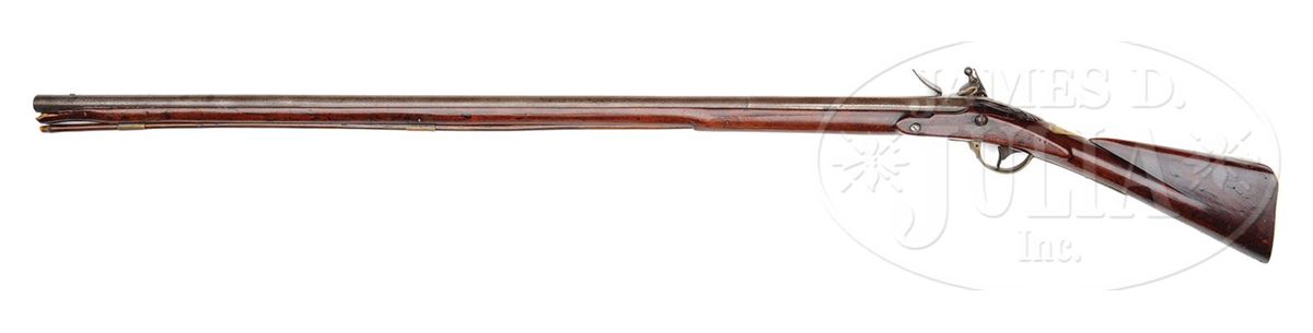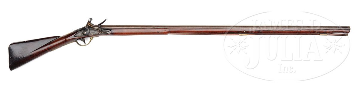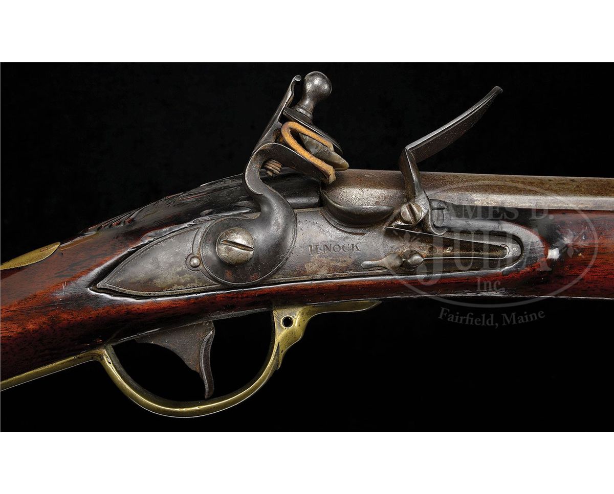 NSN. .82 Cal x 44-1/4" long part rnd part oct (10-1/4") having a front sight set back 1-3/4". Marked on left side of breech flat Crown / "RI" over Crown in a sunken oval, over Crown / "P" in a sunken oval. 6" lockpate marked under unbridled pan "H NOCK" (1741-1804). Brass furniute consists of 2 rammer pipes, plain trigger guard with rounded finial, plain buttplate held on with 7 nails. No side plate and a heart shaped escutcheon. Stock is 59" long having a fowling piece drop to the butt nicely incised shell carving behind bbl tang. PROVENANCE: Collection of Dr. Douglas Sirkin. CONDITION: Bbl and lock show only a light staining and a rebushed touch hole. Lock appears to be orig flint with minor pitting in the pan area. Brass furniture shows a nice mellow age. Stock is in very nice condition with an old wood rammer that is 33" long. Trigger guard has hole for a sling swivel while forestock does not indicating that the metal was salvaged from another gun. No cracks or splits and only minor handling nicks and dings. 4-49957 PAS20