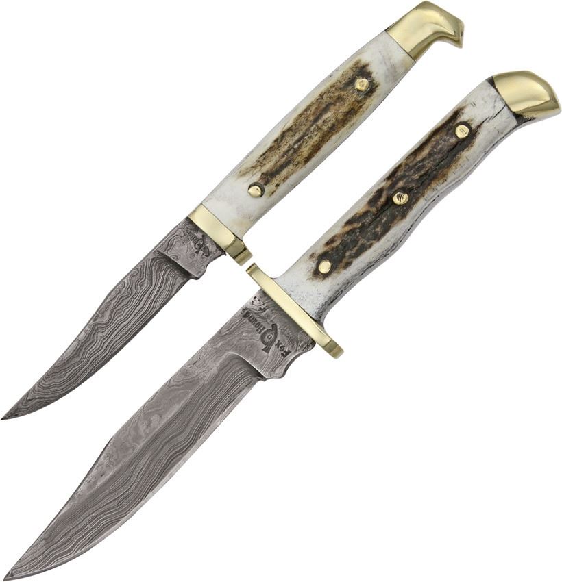 Includes 7 3/8" overall fixed blade with 3 7/8" Damascus steel blade and 6 1/8" overall fixed blade with 2 3/4" Damascus steel blade. Knives are full tang and have genuine stag handles with brass guard and pommel. Tan leather belt sheath holds both knives.