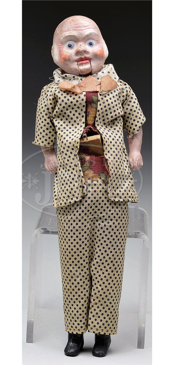 Foxy Grandpa a popular early 20th century comic figure is depicted in this German made version of a child's toy. An extremely well detailed papier mache head affixed to a body with papier mache limbs and dressed in the appropriate clothing of the time period. The bellow (inoperative) contained within his stomach, when pressed he would squeak and his jaw would drop open. Many various toys of various materials were made over the years portraying Foxy Grandpa. This is a nice untouched all original and seldom found example! SIZE: 11" t. CONDITION: Overall some light soiling to papier mache head. Exposed bellows due to weakness/tear on shirt of figure. 1-13465