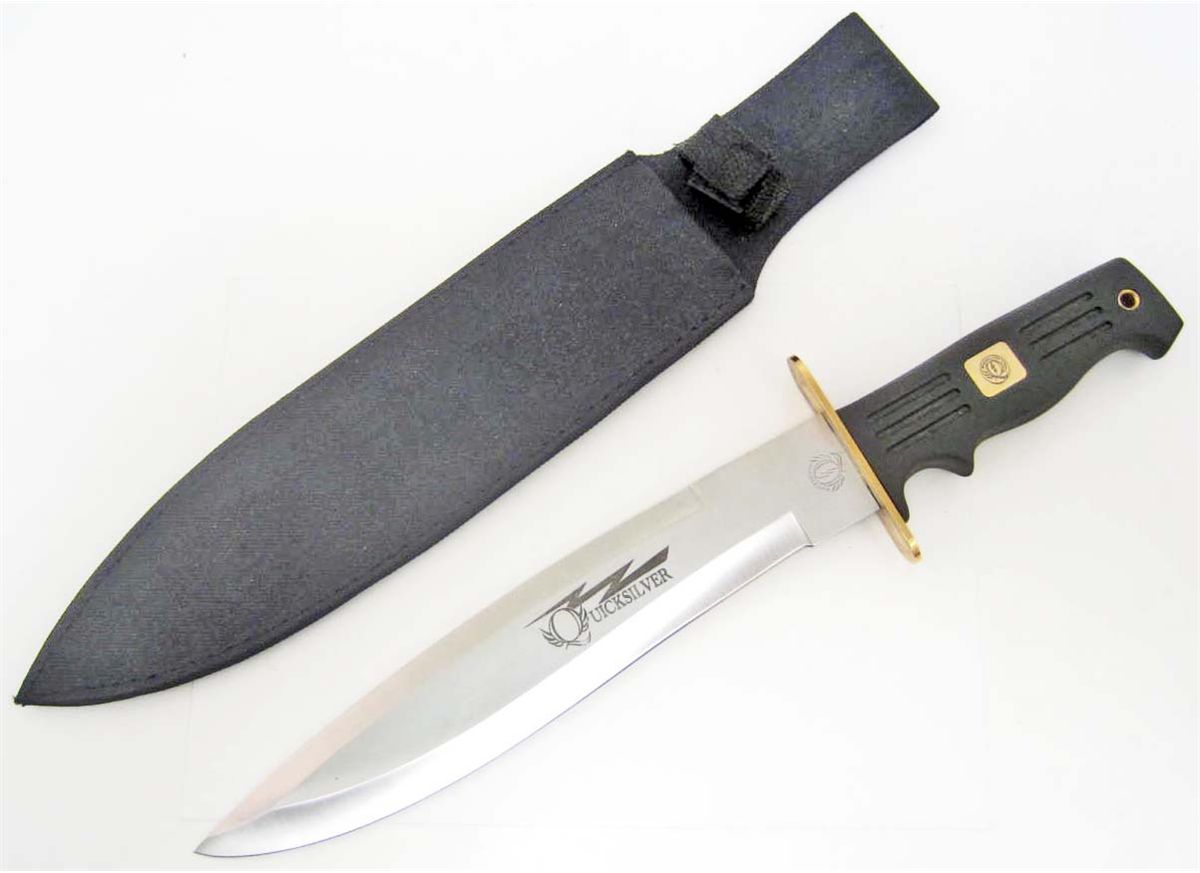 15" overall. 10" stainless bowie blade etched Quicksilver. Grooved black composition handles. Brass guard. Inlay shield. Lanyard hole. Black nylon belt sheath.