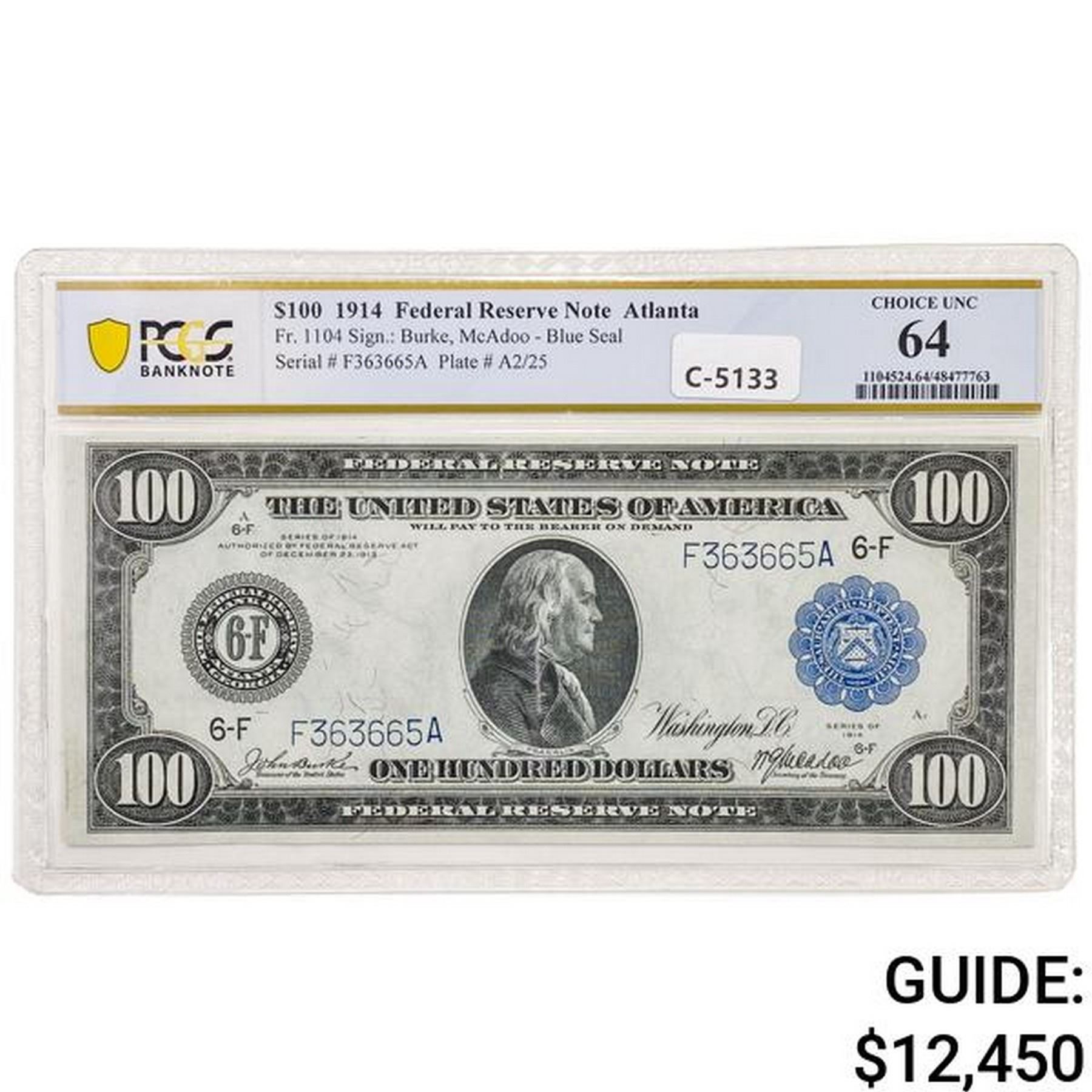 FR. 1104 1914 $100 FRN FEDERAL RESERVE NOTE ATLANTA, GA PCGS BANKNOTE CHOICE UNCIRCULATED-64