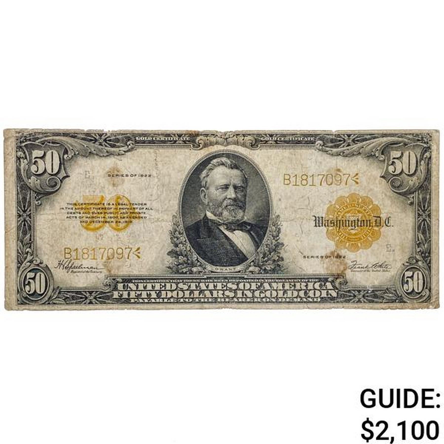 FR. 1200 1922 $50 FIFTY DOLLARS GRANT GOLD CERTIFICATE CURRENCY NOTE VERY FINE