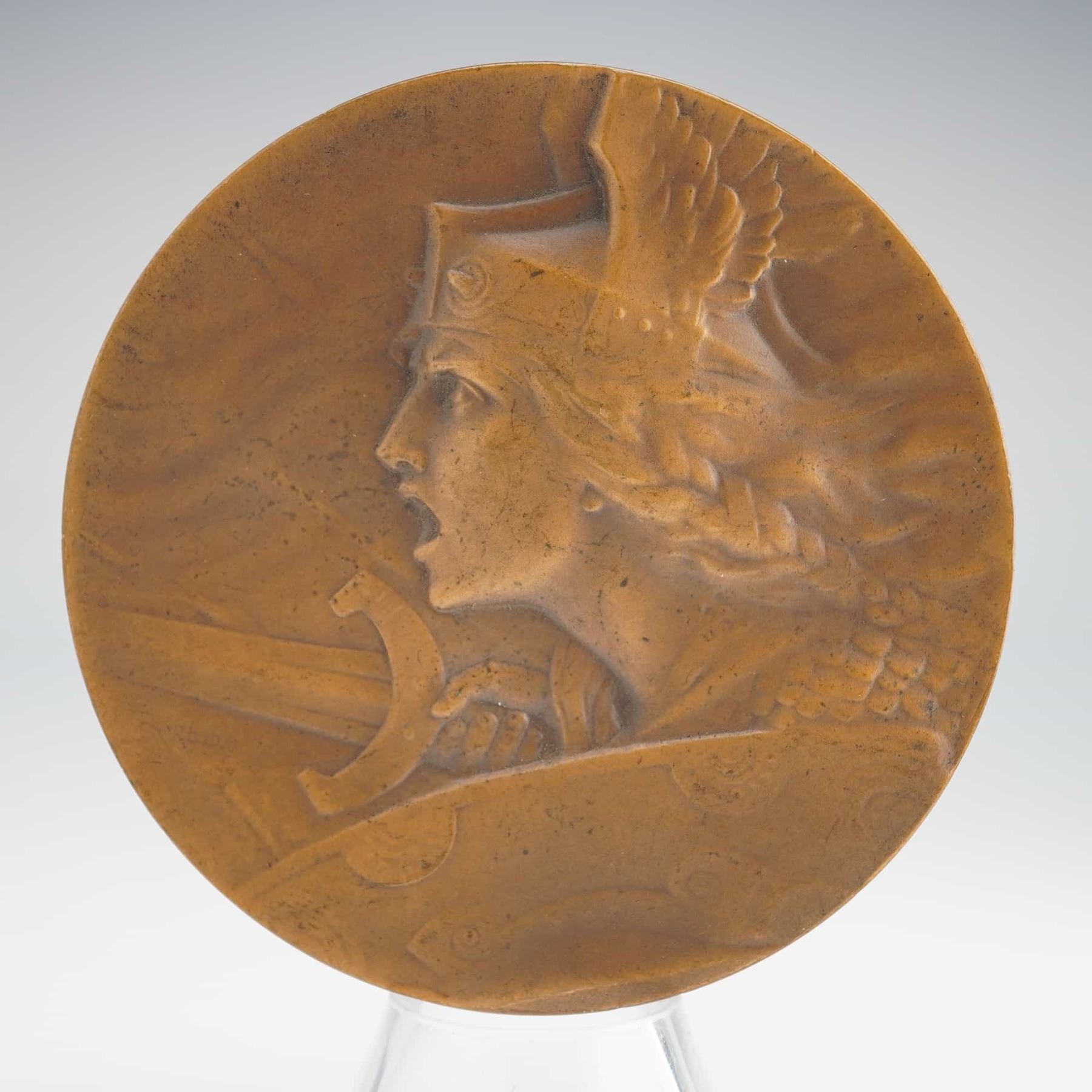 Pierre-Alexandre Morlon. Furens Gallia (Raging France), also known as Aux Armes (To Arms) obverse. Key identifiers include the incised RALLYE PAPER / DOURDAN 14 JUIN 1914 inscription on the reverse. This patinated bronze medal features the iconic Art Nouveau allegorical design by Morlon, utilized here for a local commemorative purpose in June 1914.
