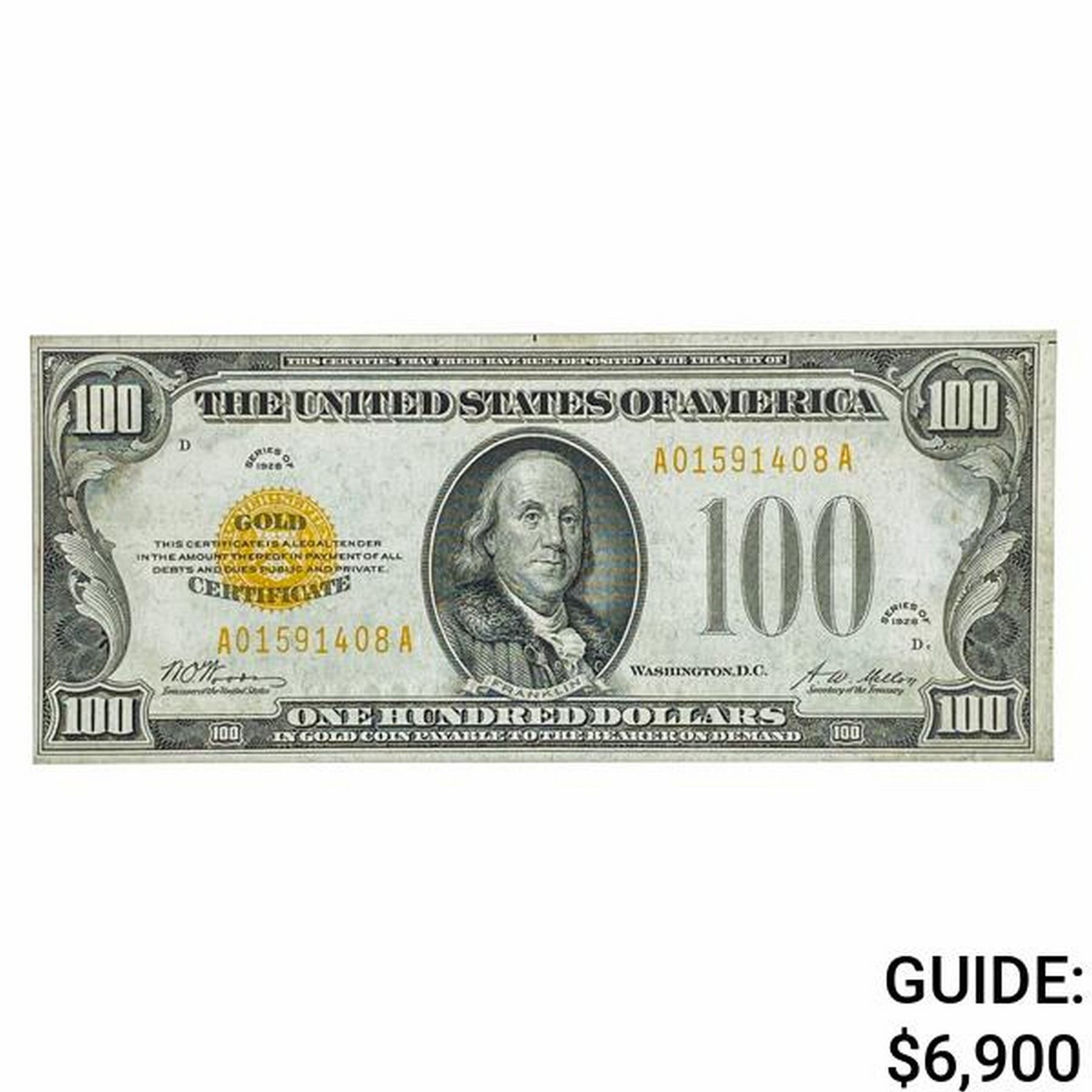 FR. 2405 1928 $100 ONE HUNDRED DOLLARS GOLD CERTIFICATE CURRENCY NOTE ABOUT UNCIRCULATED