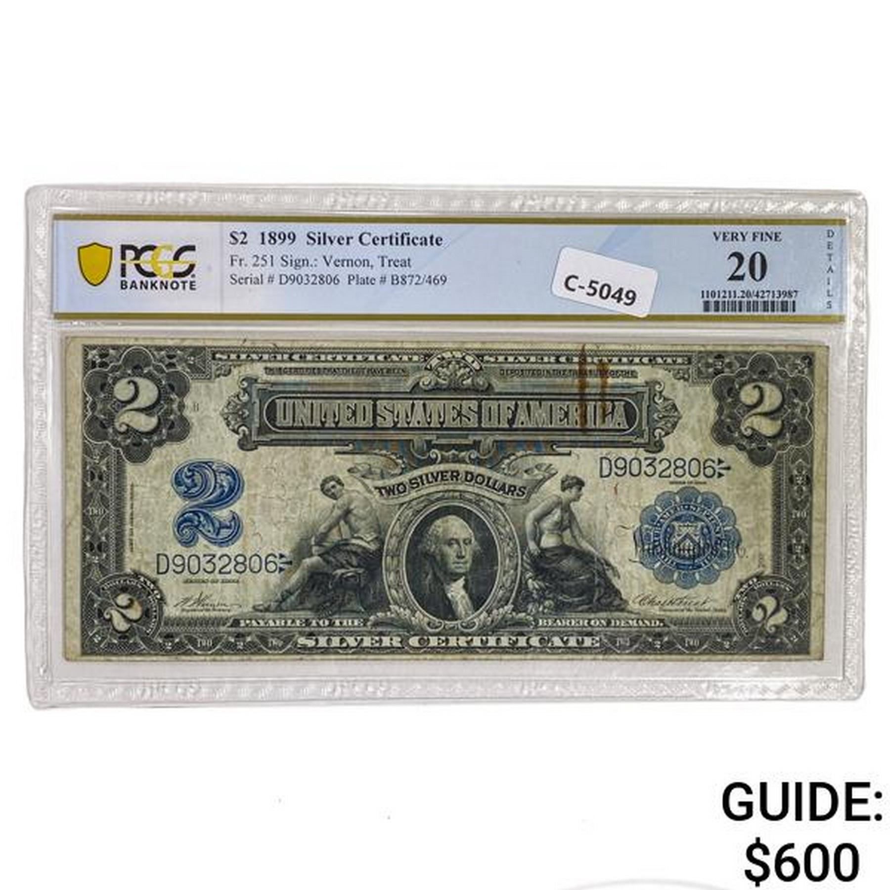 FR. 251 1899 $2 TWO DOLLARS MINI PORTHOLE SILVER CERTIFICATE PCGS BANKNOTE VERY FINE-20