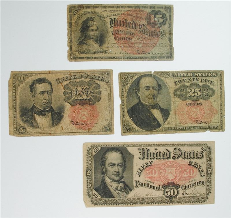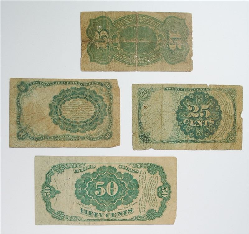 FRACTIONAL CURRENCY 4 PCS: 1874 TEN CENT, 1875 FIFTY CENT, 1874 TWENTY-FIVE CENT