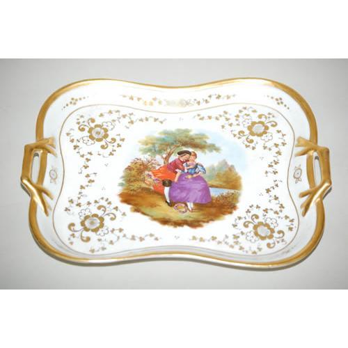 FRAGONARD DECCORATED KPM PORCELAIN PIN TRAY - SHAPED DRESSER TOP PIN TRAY W/ ROMANTIC COUPLE IN A LANDSCAPE PAINTED DECORATION & GILT HIGHLIGHT DECORATIONS-SIGNED FRAGONARD & MARKED W/ BLUE KPM MARK (9 3/4" X 7 3/8")- WEAR, SCRATCHES, IMPERFECTIONS