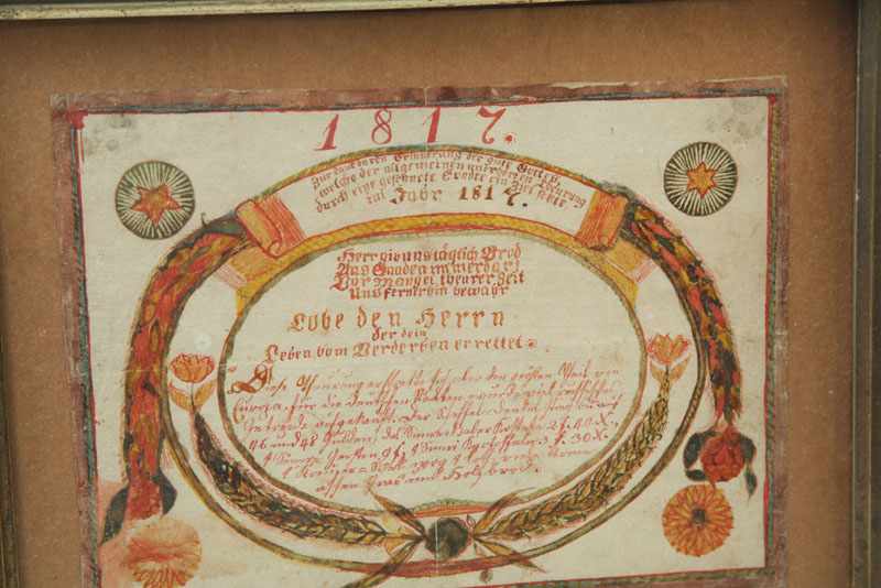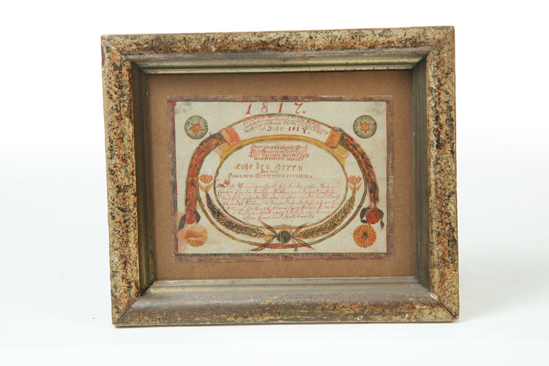 American, 1st quarter-19th century, watercolor and ink on laid paper. Interesting format with circular wreath and star rosettes. German text dated 1817. Wear and stains. 10 1/2"h. 12 1/2"w.