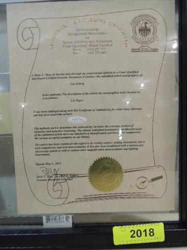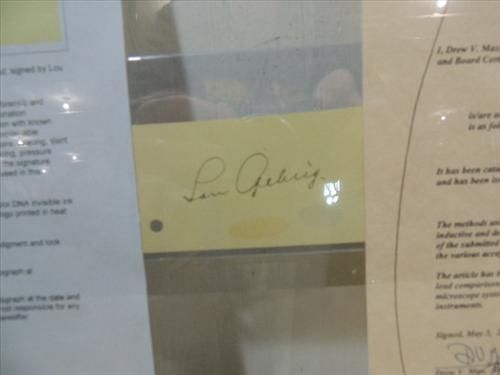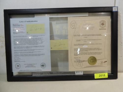 FRAMED 22X14 CUT SIGNATURE AUTOGRAPH LOU GEHRIG COA. INCLUDES COA FROM AUTHENTIC AUTOGRAPHS UNLIMITED #F10718. AS SHOWN. VIEW PICTURE FOR DETAIL. PLEASE BE ADVISED, AND INFORMED REGARDING SIGNATURES OR AUTOGRAPHS THAT WE SELL AT AUCTION: WE ARE NOT AUTHENTICATORS, AND WE DO NOT AUTHENTICATE, OR VALIDATE ANY AUTOGRAPHS OR SIGNATURES THAT WE OFFER AT AUCTION. SOME AUTOGRAPHS OR SIGNATURES MAY COME WITH AN AUTHENTICATION FROM ANY ONE OF LITERALLY HUNDREDS OF AUTHENTICATORS ACROSS THE COUNTRY, AND AROUND THE WORLD. WE DO NOT ENDORSE ANY AUTHENTICATOR, NOR DO WE GUARANTEE THAT ANY AUTOGRAPH OR SIGNATURE IS AUTHENTIC, OR THAT IT WILL PASS AUTHENTICATION BY ANY AUTHENTICATOR. ALL AUTOGRAPHS OR SIGNATURES ARE SOLD