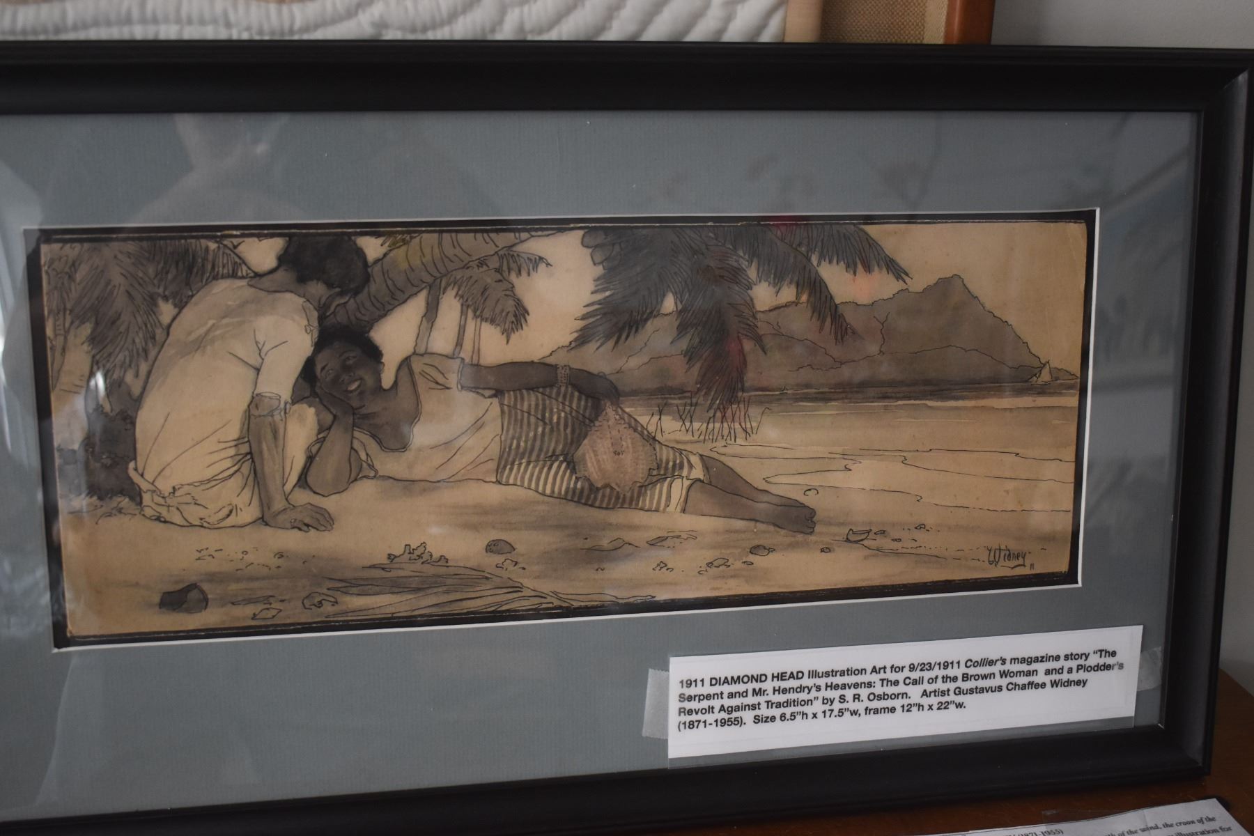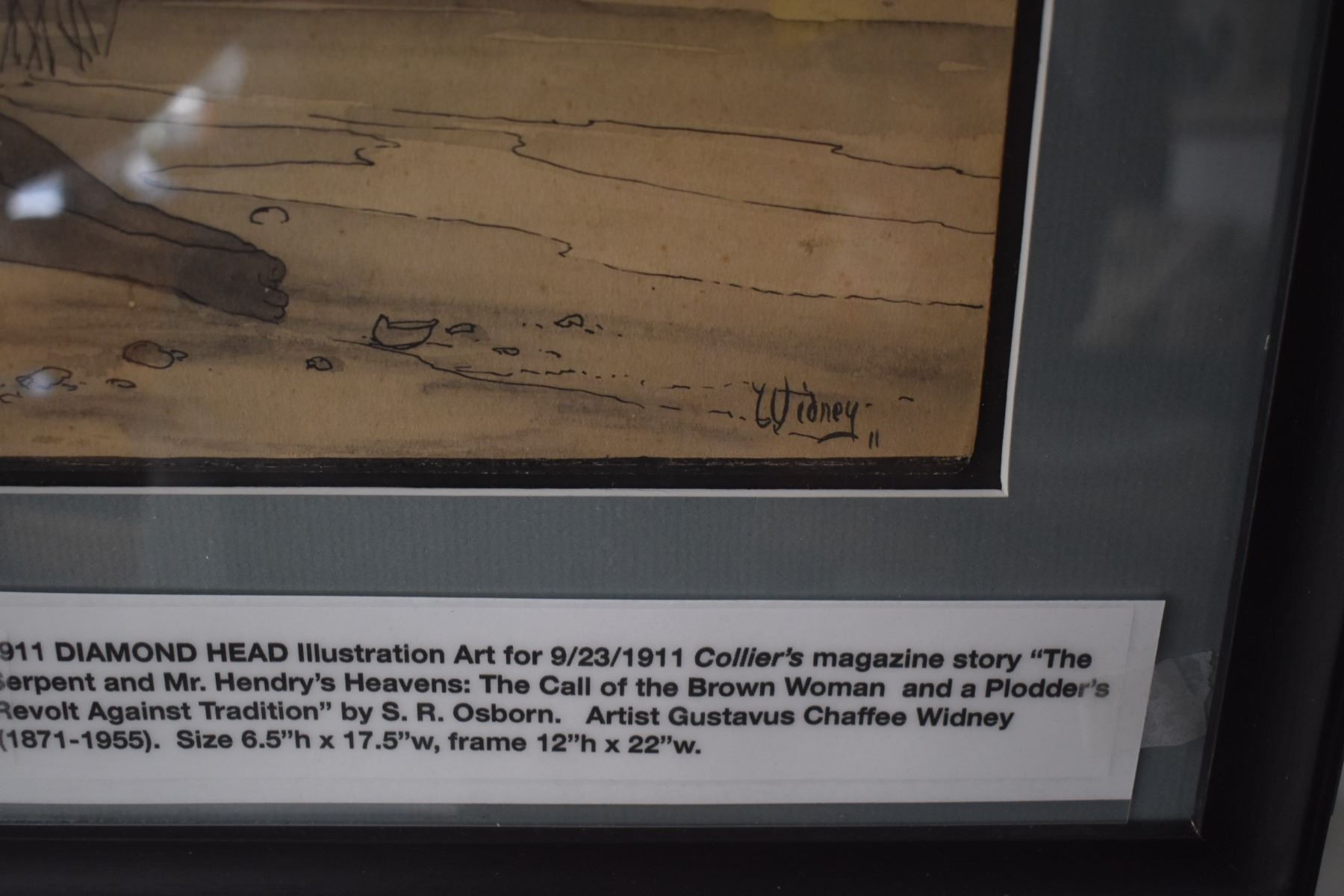 FRAMED 1911 DIAMOND HEAD ILLUSTRATION ART FOR 9/23/1911 COLLIER'S MAGAZINE; BY GUSTAVUS CHAFFEE WIDNEY (1871-1955) (17 1/2" X 6 1/2")