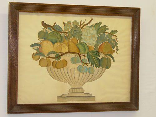FRAMED 19TH CENT. WATERCOLOR THEORUM ON PAPER CUT-OUT COMPOTE OF FRUIT, UNSIGNED - SCRATCHES, TONING & IMPERFECTIONS