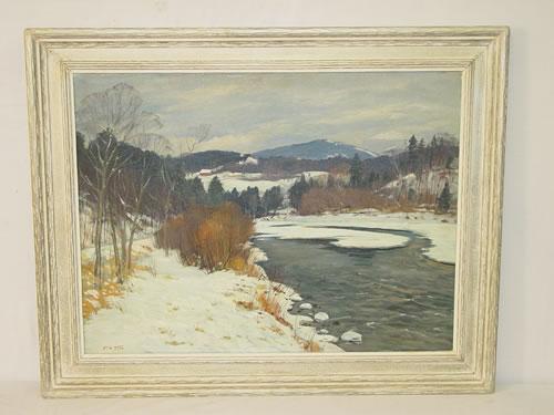 FRAMED 20TH CENT. OIL ON ARTIST BOARD OF NEW ENGLAND WINTER SCENE TITLED ON REVERSE AMMUNOOSIC RIVER BATH NH "MARCH DAY" 1957, SIGNED LOWER RIGHT E.A. TITUS (23" X 31") - MINOR IMPERFECTIONS, DIRTY