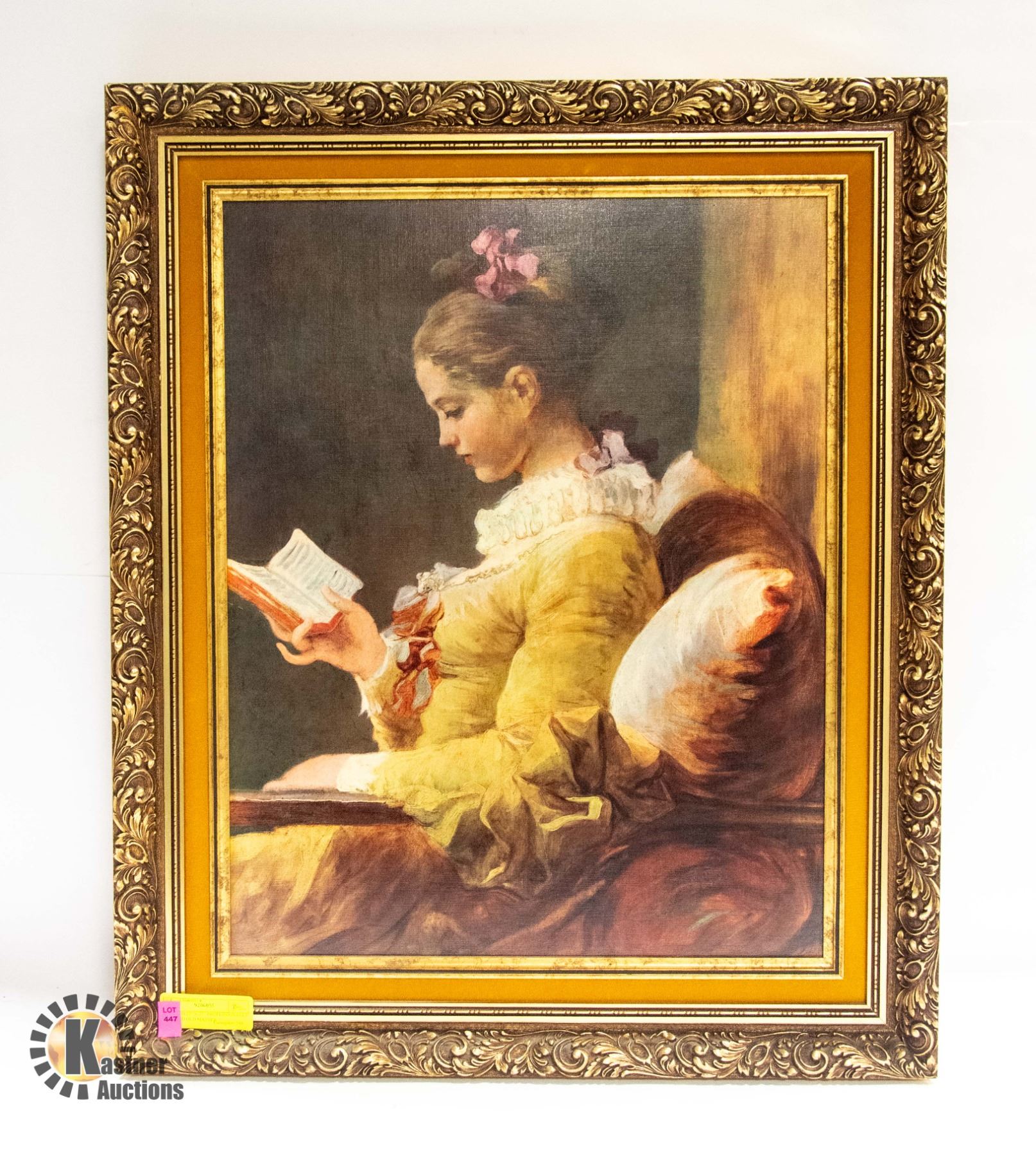 YOUNG LADY READING. THE REPRINT ON CANVAS WAS PURCHASED IN FRANCE OVER 40 YEARS AGO, AND THEn FRAMED IN EDMONTON. **ALL ITEMS MUST BE REMOVED BY 5PM SATURDAY, SEPTEMBER 9TH 2023. ALL REMAINING ITEMS WILL BE SUBJECT TO A $6.00 PER DAY STORAGE CHARGE. ANY ITEMS REMAINING AFTER MONDAY, SEPTEMBER 25TH, 2023 WILL BE CONSIDERED FORFEITED. NO REFUNDS WILL BE ISSUED FOR FORFEITED ITEMS. TO SCHEDULE A PICK UP APPOINTMENT CLICK HERE
