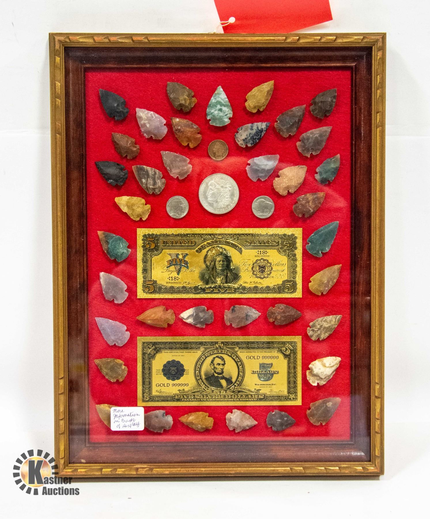 FRAMED 37 ARROWHEADS, COINS ETC. DISPLAY