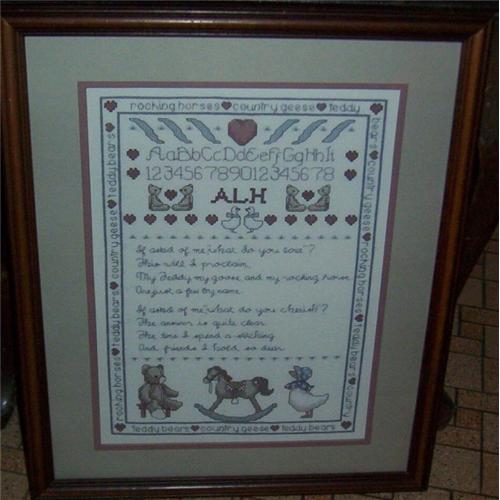 This auction is for a framed and matted 18" X 15" crossed-stitched baby sampler ...The matte is a light grey with a mauve inner boarder to match the mauves and blue in the sampler...The cross-stitch boarder has then words; rocking horses, country geese, and teddy bears with hearts...In the inside is are bears, geese, and rocking horse...There is also a verse: "If asked of me, "what do I love"? This will I proclaim, My Teddy , my goose, and my rocking horse.Are just a few by name.I asked of me, "What do you charish"? The answer is quite clear.The time I spend a-stitching and friends I hold dear."...In between the bears are the initials ALH ..I think this is done on 18 count and it was not dated or signed...Whom ever did this , did a beautiful job and had many, many hours in doing this sampler...The frame is dark wood, finished on back, and has glass in front and weighs 3.5 pounds before packing....For further questions contact me?Thank you for looking at my Shoppe..