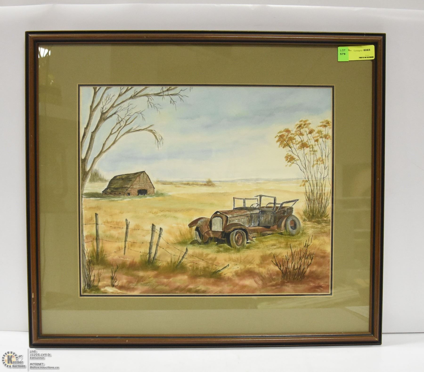 FRAMED ANTIQUE CAR PICTURE APPROX 22" X 25"