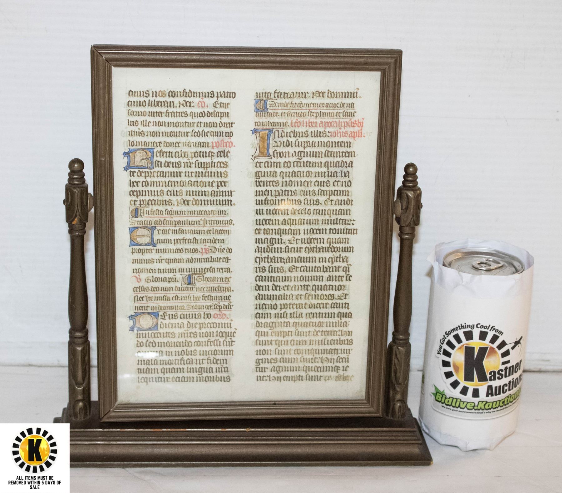 1 FRAMED FRANCISCAN MISSAL PAGE IN LATIN, 2-SIDED GLASS IN GIMBALLED FRAME (9” X 7”), LABELLED: FRANCE 1380 A.D.