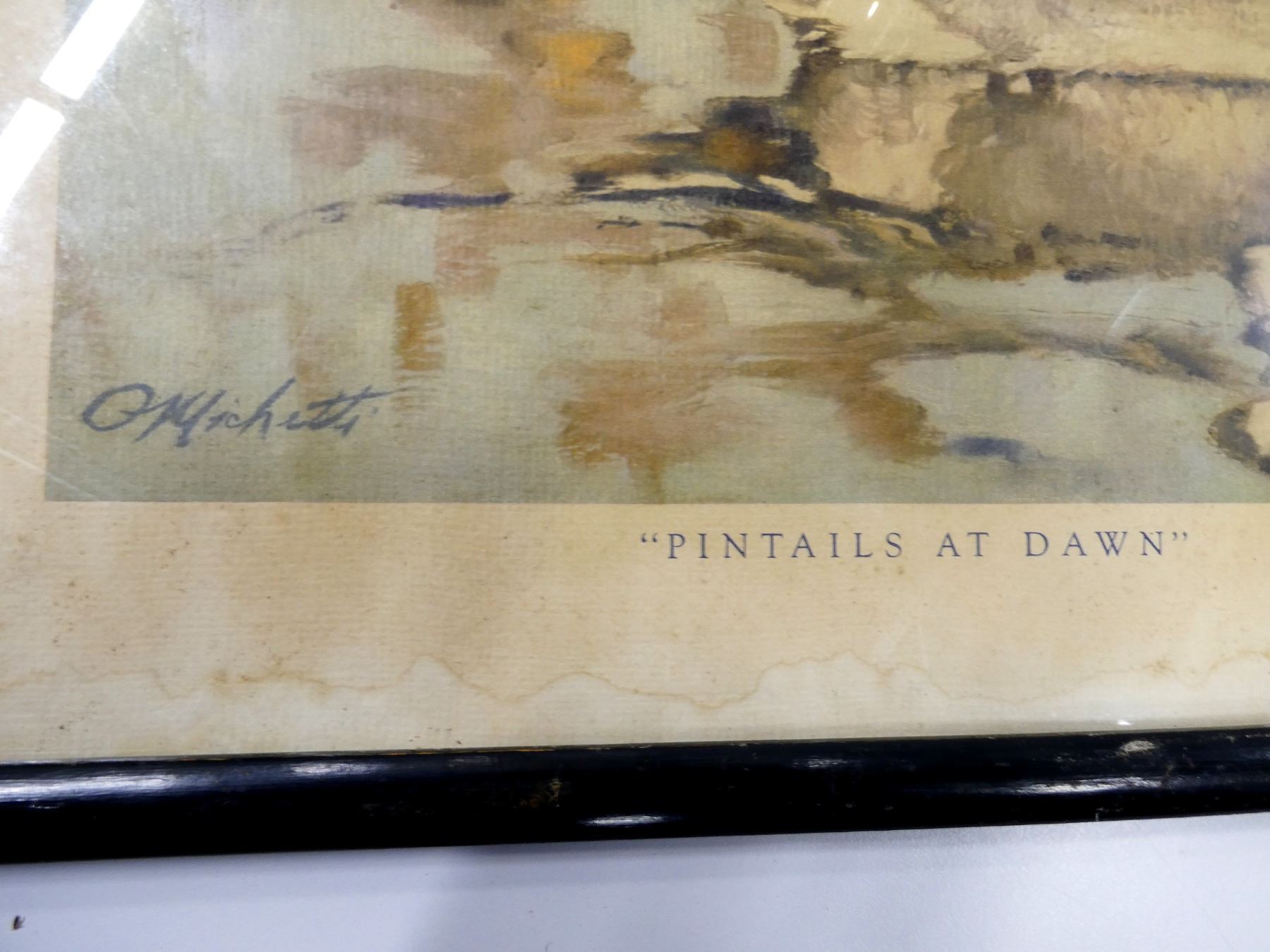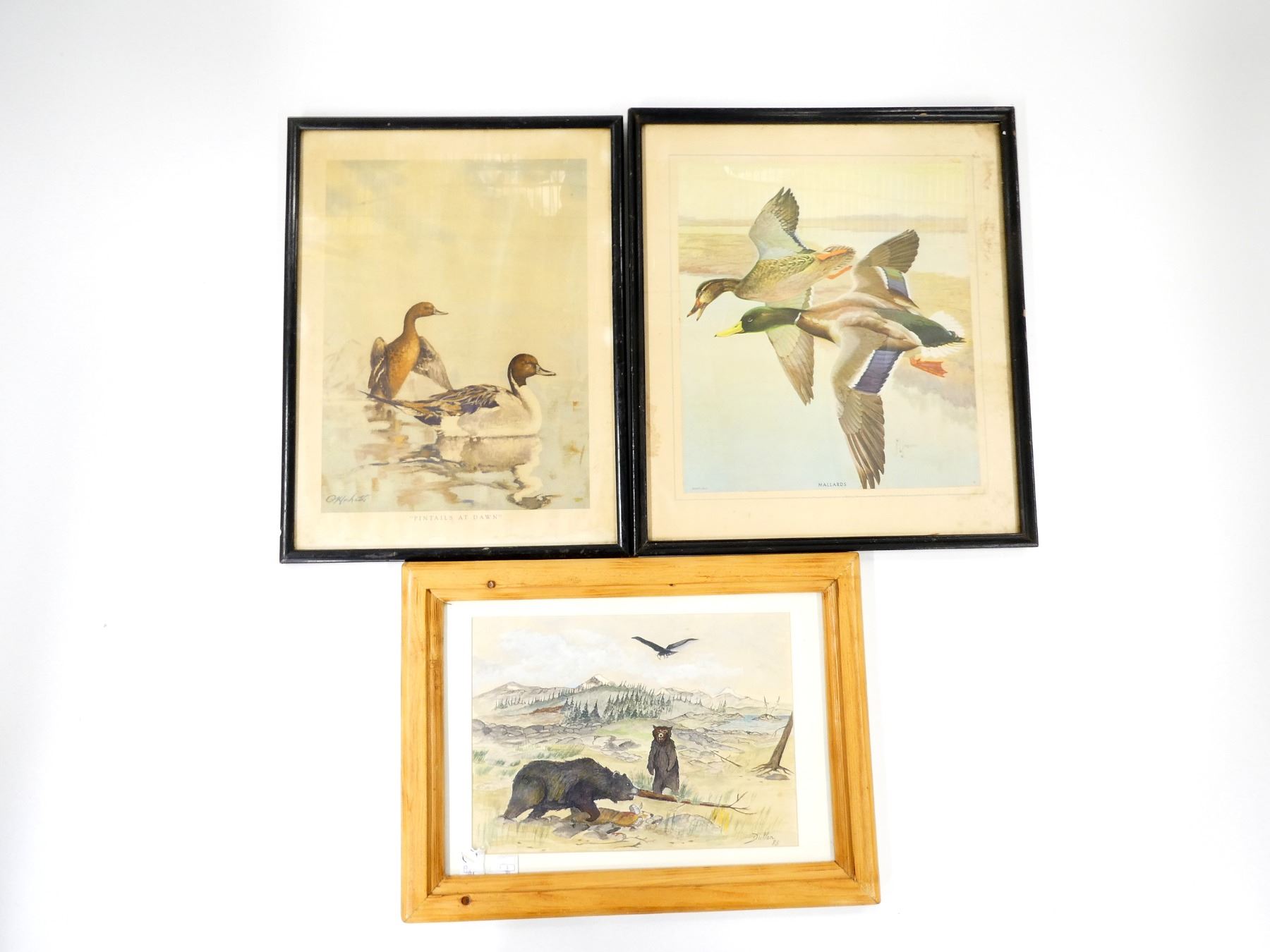 LOT INCLUDES; (1) "PINTAILS AT DAWN" PRINT, BY MICHETTI, WOOD FRAME, UNDER GLASS, SHOWS WEAR & TEAR / AGE, APPROX. 12.5" X 16.5" X 0.5", (1) "MALLARDS" PRINT, BY AOLPH-CLARK-STONE LTD, WOOD FRAME, UNDER GLASS, SHOWS WEAR & TEAR / AGE, 14.75" X 17" X 0.5", (1) BROWN BEAR DRAWING, BY DUTTON, DATED 83, WOOD FRAME, UNDER GLASS, APPROX. 16.5" X 12.25" X 1". SEE PHOTOS. NO GUARANTEE ON GLASS FOR SHIPPING.