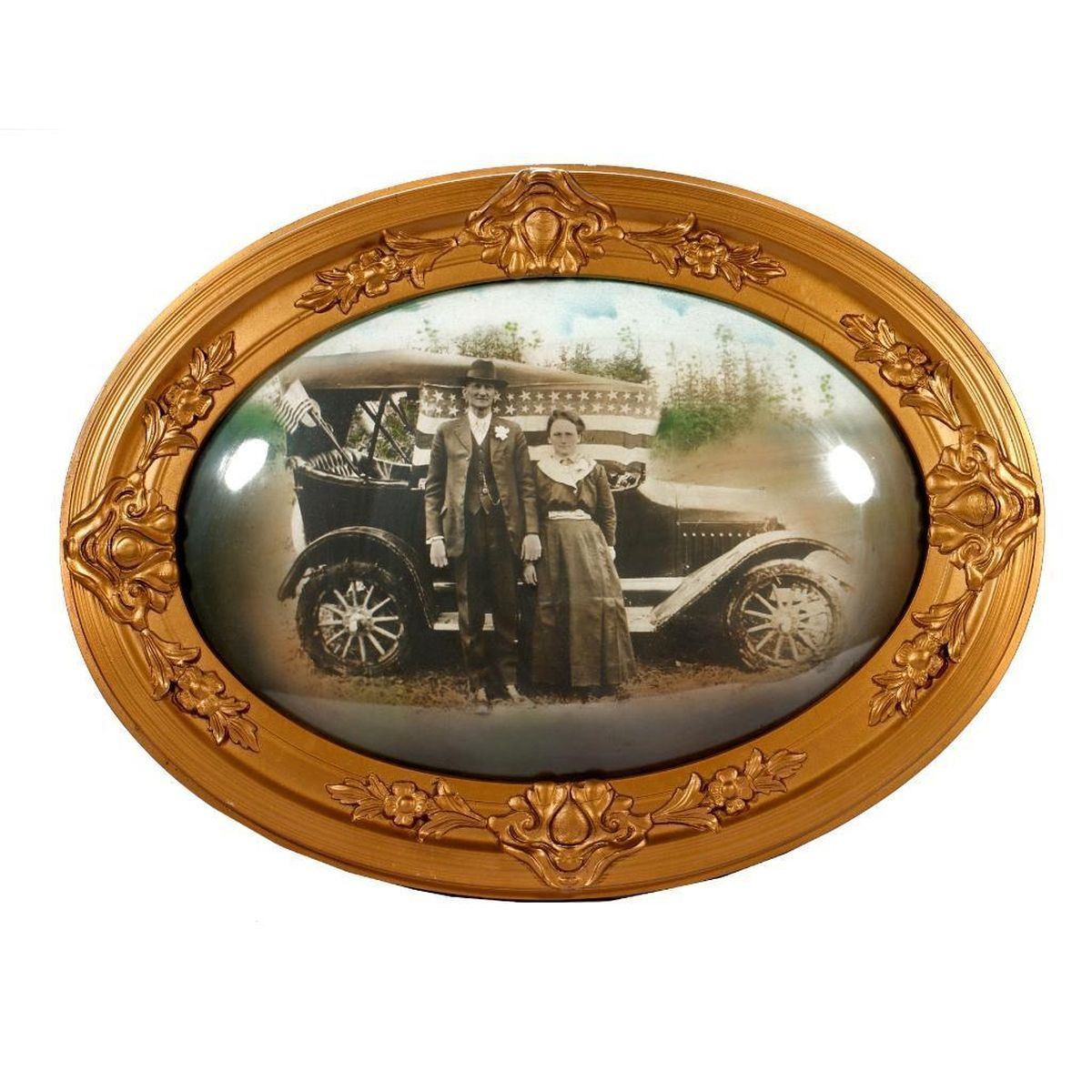 A hand-tinted convex image of a patriotic couple standing in front of their flag-draped automobile; in an oval convex glass period frame. 13in. x 18 3/4in. (sight); 18 1/2in. x 25in. Condition: The frame appears to be repainted; the photo is in good condition, some fading.