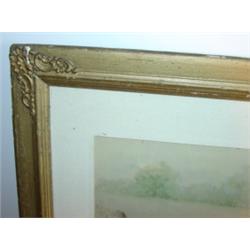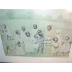 FRAMED BLACK AMERICANA PRINT. Ornate gilt frame. Print depicts African-American children playing in yard. Print is marked in lower left "E.M. Ashe-'89". 19.5" x 16.5" framed.
