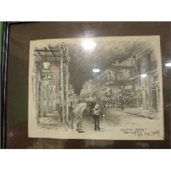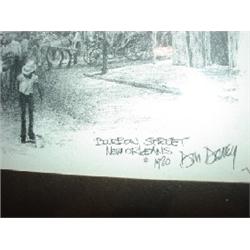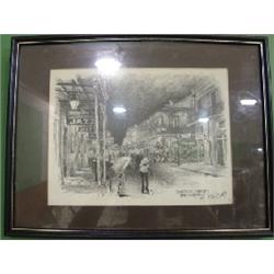 FRAMED BLACK AMERICANA PRINT OF CHARCOAL SKETCH. Depicts Bourbon Street in New Orleans, Louisiana. Signed in lower right “Bourbon Street, New Orleans, 1980, Dan Davey”. 16.5” x 13” framed.