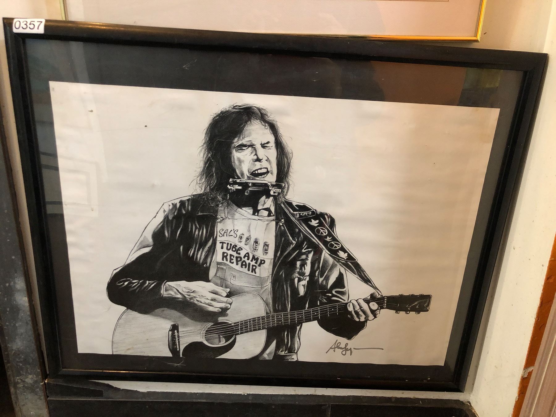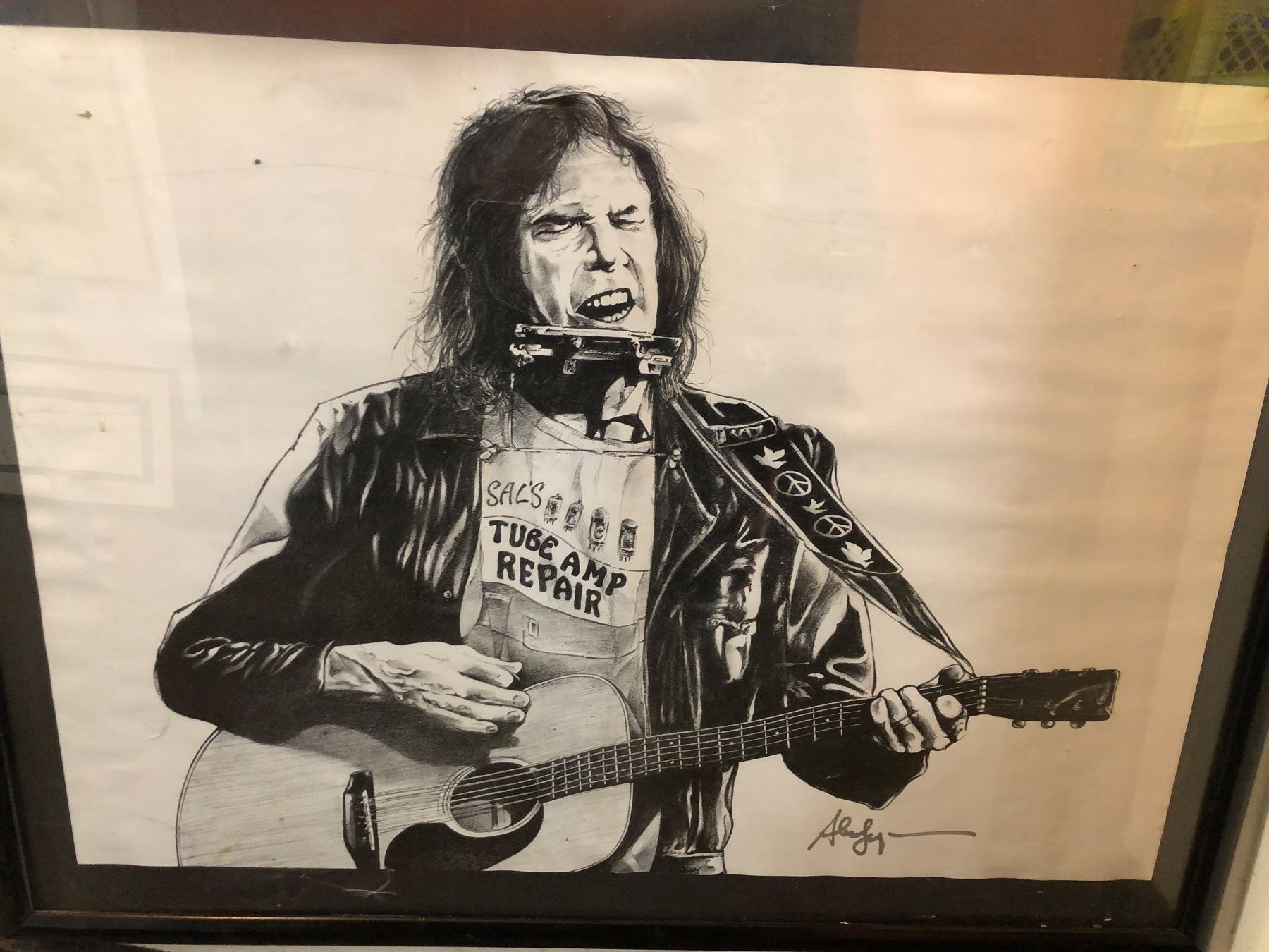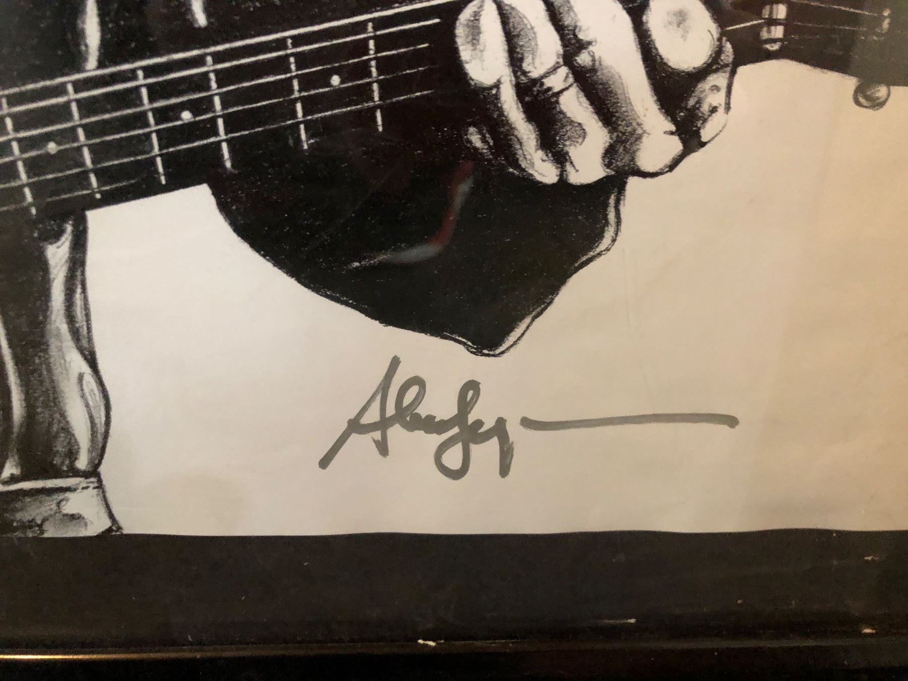 FRAMED BLACK AND WHITE MUSICIAN PLAYING GUITAR AND HARMONICA PAINTING/ PRINT APPROX 29IN X 23IN
