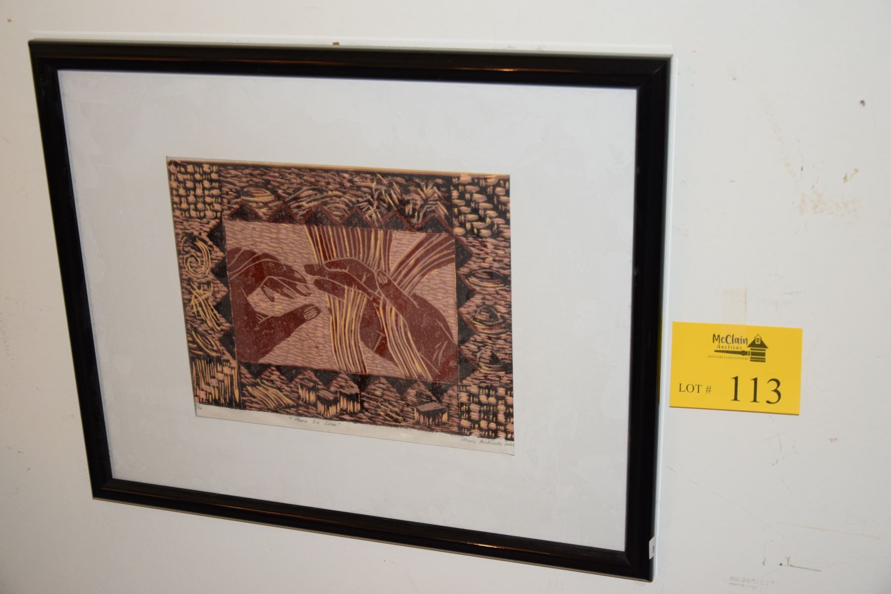 FRAMED BLOCK PRINT, "HANA KA LIMA"; SIGNED MAILE ANDRADE, 2005 8/16