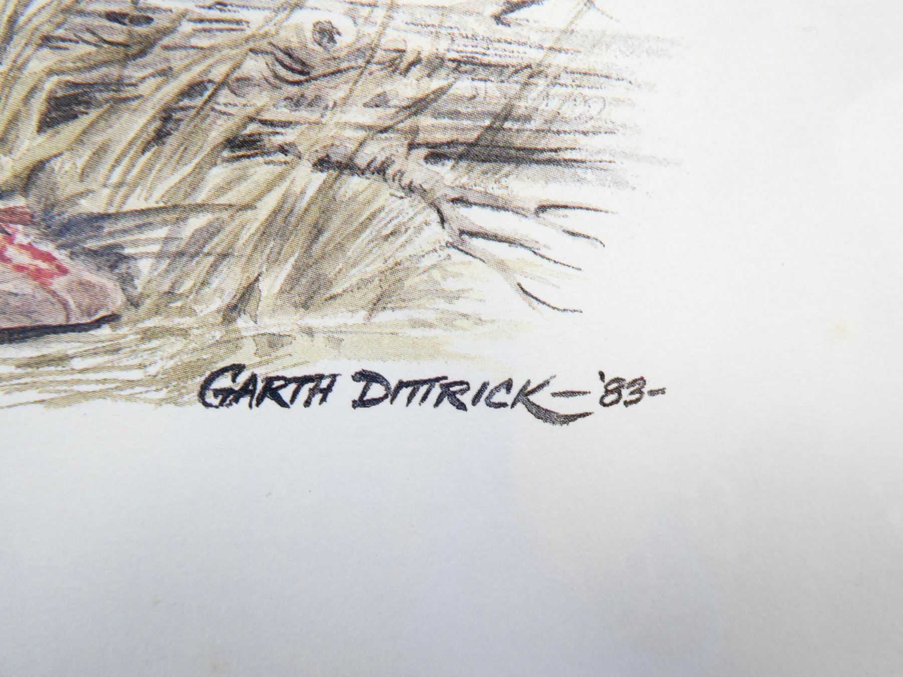 (1) BY GARTH DITTRICK, DATED 1983, METAL FRAME, UNDER GLASS, APPROX. 12.25" X 17.25" X 0.75". SEE PHOTOS. *NO GUARANTEE ON GLASS FOR SHIPPING*