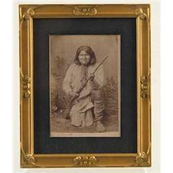 FRAMED CABINET CARD - FAMOUS IMAGE OF GERONIMO. 7” x 4-1/2” cabinet card depicting Geronimo on one knee holding a cut-down musket. The intense gaze and set jaw evoke the qualities that made the U.S. authorities fear him and keep him confined as a prisoner of war until the end of his life, long after he and his people has ceased to be a threat. Stamped or printed in purple ink at bottom margin "Geronimo, Apache chief. CONDITION: Very good, with a little soiling. 4-50109 SO7