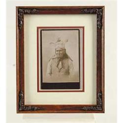 FRAMED CABINET CARD PHOTO OF GERONIMO. 6-1/2” x 4-1/4” cabinet card photo of an elderly Geronimo in a shirt and vest wearing a decorated headdress in a vignetted studio pose. The card is unmarked with gold beveled edges and no back stamp or inscription. CONDITION: Very good, with only slight soiling and negligible wear. 4-50115 SO10