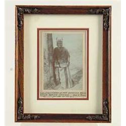 FRAMED CABINET CARD PHOTO OF GERONIMO 7-1/2” x 5-1/4” cabinet card photo by Irwin, Chichasa I.T. depicts Geronimo in the same costume he wore when posing for the famous Fort Sill photograph holding a Dance revolver - presumably during the same sitting with the same photographer. CONDITION: Very good. 4-50114 SO4
