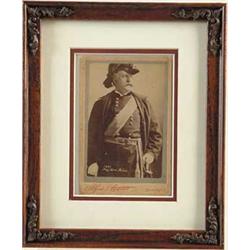 FRAMED CABINET CARD PHOTOGRAPH OF GENERAL NELSON MILES. 6-1/2” x 4-1/4” cabinet card photo by Alfred Campbell of Elizabeth N.J. The photo is captioned in the emulsion "1391 Maj. Gen. Miles.” It shows General Miles in full dress with sash and gloves, his sword in his left hand. General Miles had a very long career with the Army, including the Civil War and the Indian Wars, including taking Geronimo and his small band prisoners. CONDITION: Very good, with some slight staining, discoloration. 4-50117 SO22