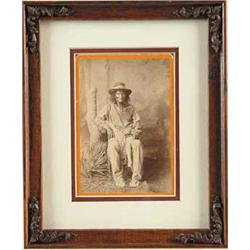 FRAMED CABINET CARD PHOTOGRAPH OF GERONIMO. 6-1/2” x 4-1/2” cabinet card showing an elderly Indian seated in a studio pose. There is no notation on the card, nor any imprint, but set of the thin lips and the piercing eyes strongly resemble Geronimo’s features. This cataloger has not encountered this particular pose as identifiably being Geronimo, and cannot guarantee the attribution. CONDITION: Very good with light edge wear, not affecting the image. Some losses to outer paper layer on back of card. 4-50122 SO18