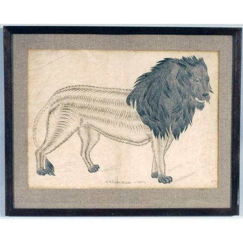 FRAMED CALLIGRAPHY OF A LION signed "C.M. Eyster Penman, 3rd Sept. 1877" 17 1/2"x 24" CONDITION REPORT: tears (one 7"), staining, toning- still presentable.