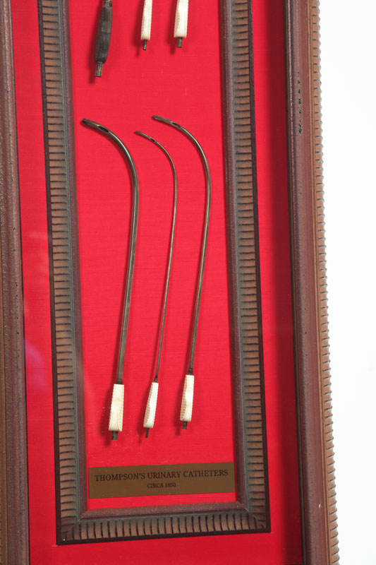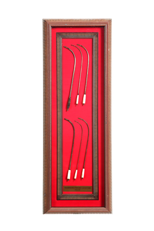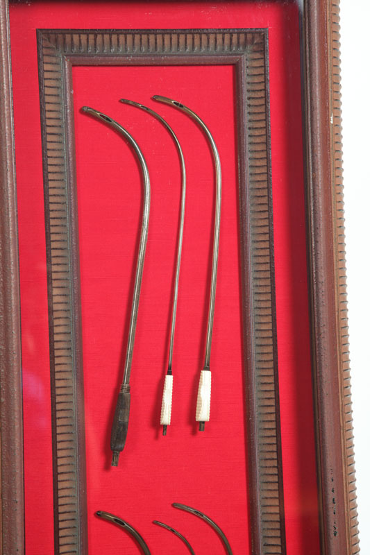 American or European, mid 19th century, metal and bone or ivory. Six urinary catheters of various size. 10"l. to 10 1/2"l. In a frame, 34"h. 12"w.