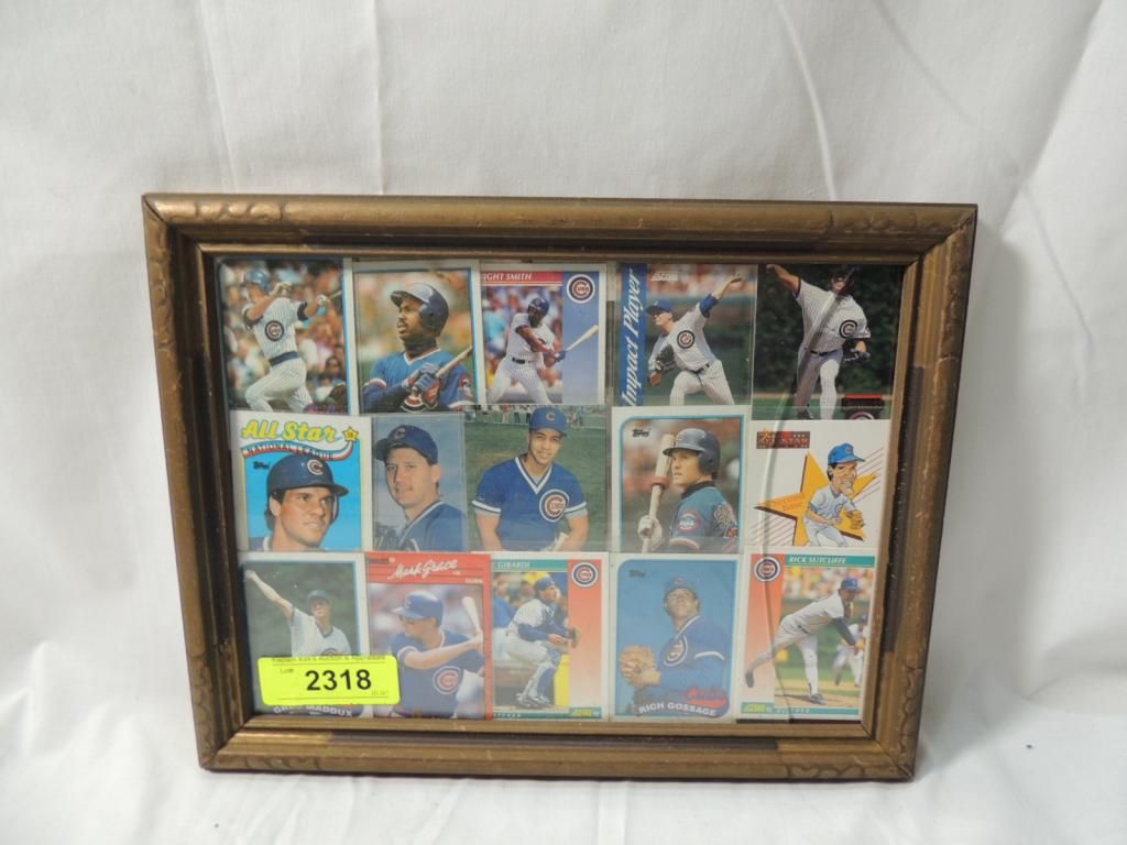 15 CHICAGO CUBS BASEBALL PLAYER CARDS. FRAMED COLLAGE TRADING CARDS AS SHOWN. SEE PHOTO FOR MORE DETAILS.