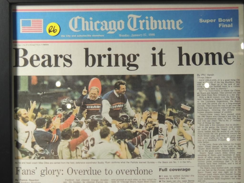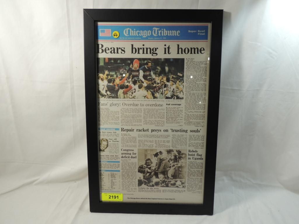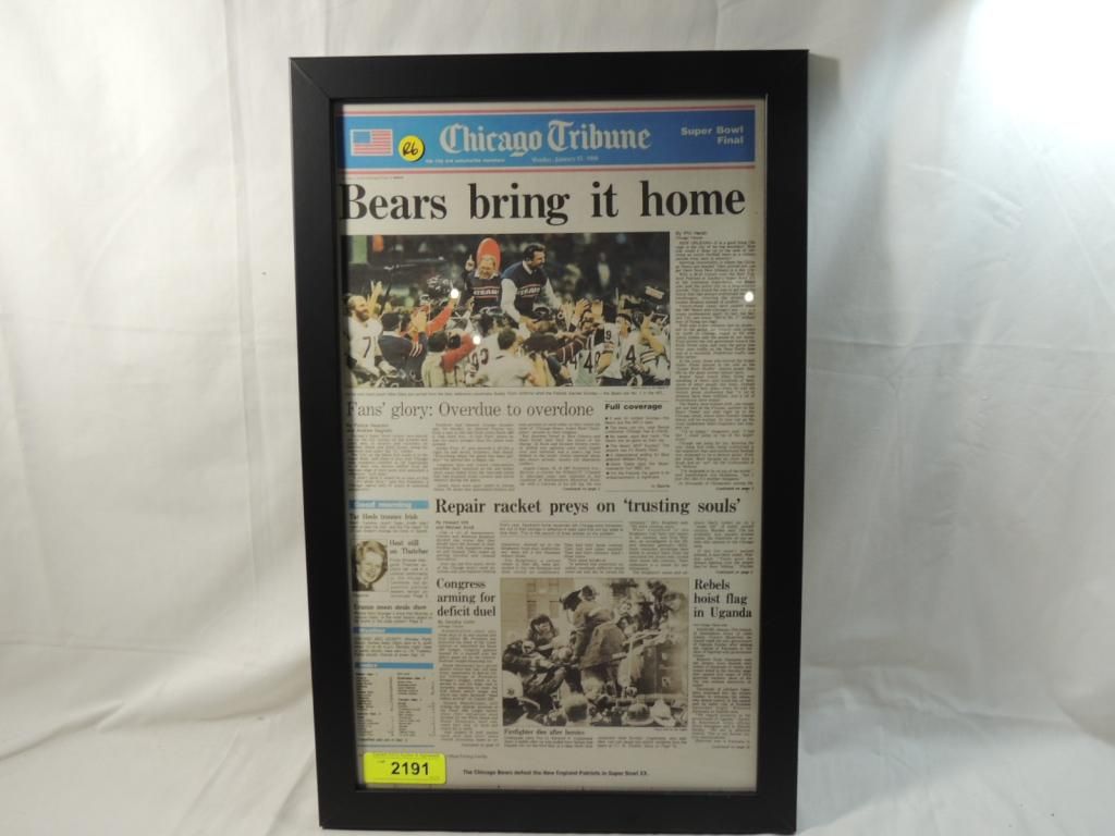 FRAMED CHICAGO BEARS HEADLINE BEARS BRING IT HOME SUPER BOWL WIN. CHICAGO TRIBUNE. AS SHOWN. SEE PHOTO FOR MORE DETAILS.