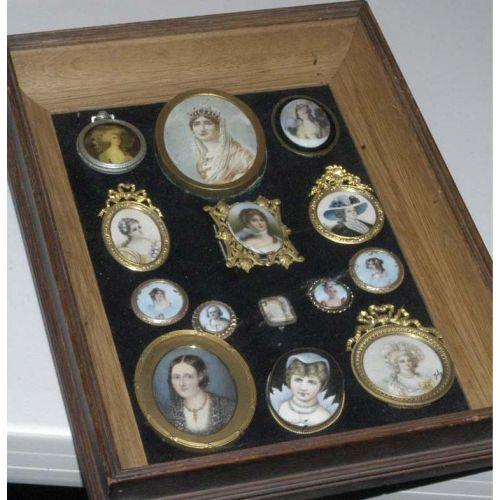 FRAMED COLLECTION OF MINIATURES, mostly handpainted, some with wear to surface, PACKING AND SHIPPING: Fairfield Auction will provide packing and shipping (excluding insurance) within the Continental U.S. for $30. Buyer is welcome to use any other service or pick-up at the gallery.