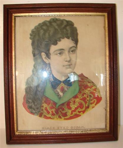 FRAMED COLORED LITHOGRAPH. Depicts a female with dark hair. Titled “Black Eyed Susan”. 13.25” x 16.5” framed.