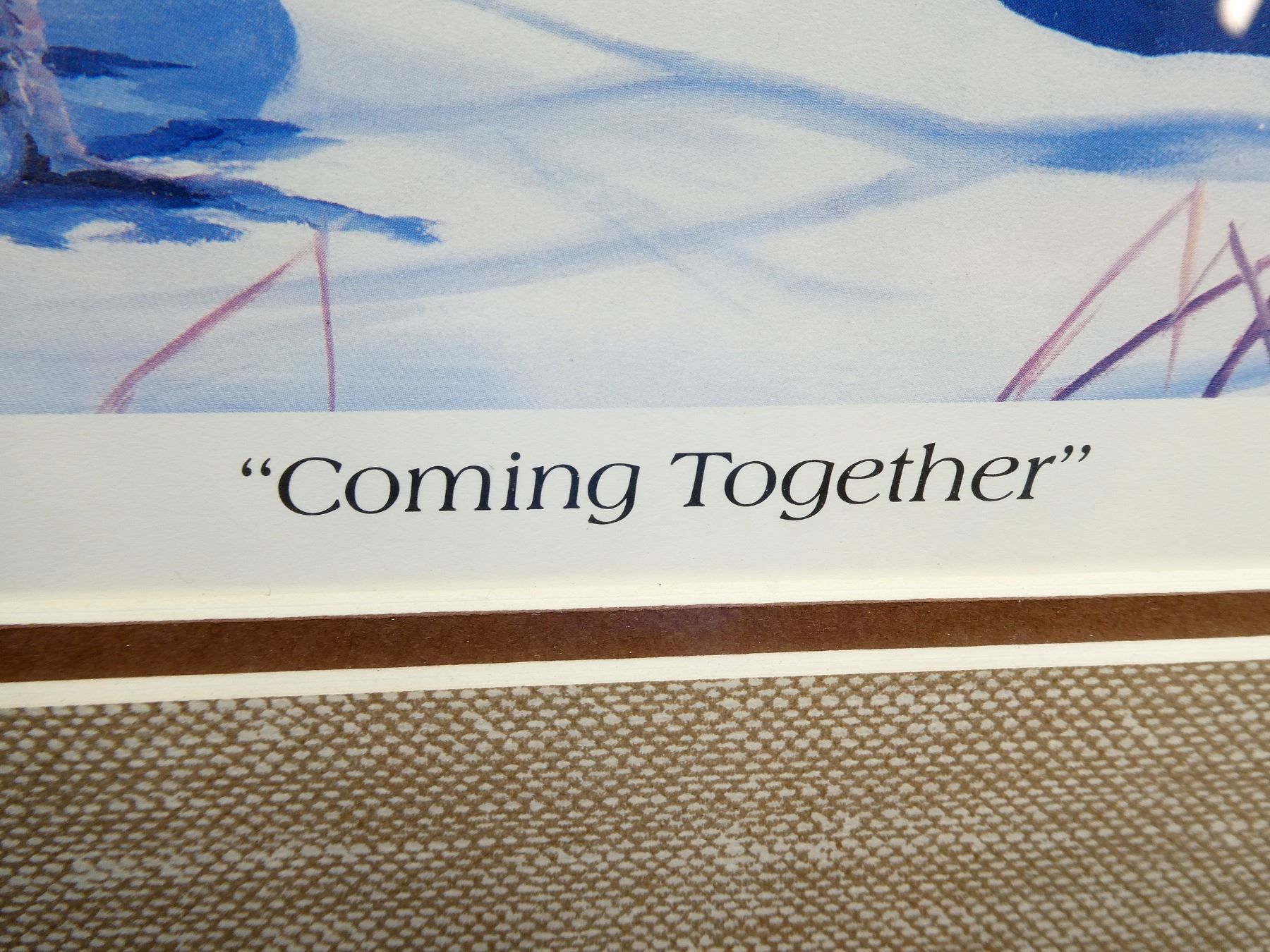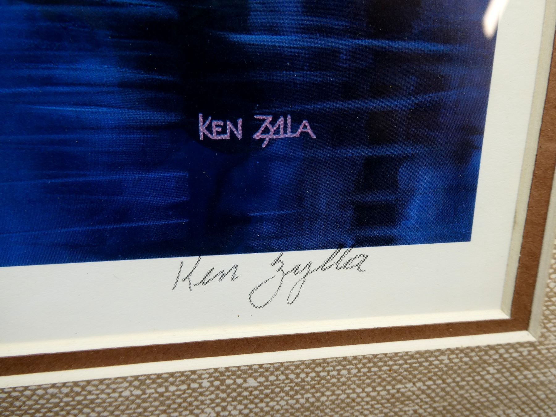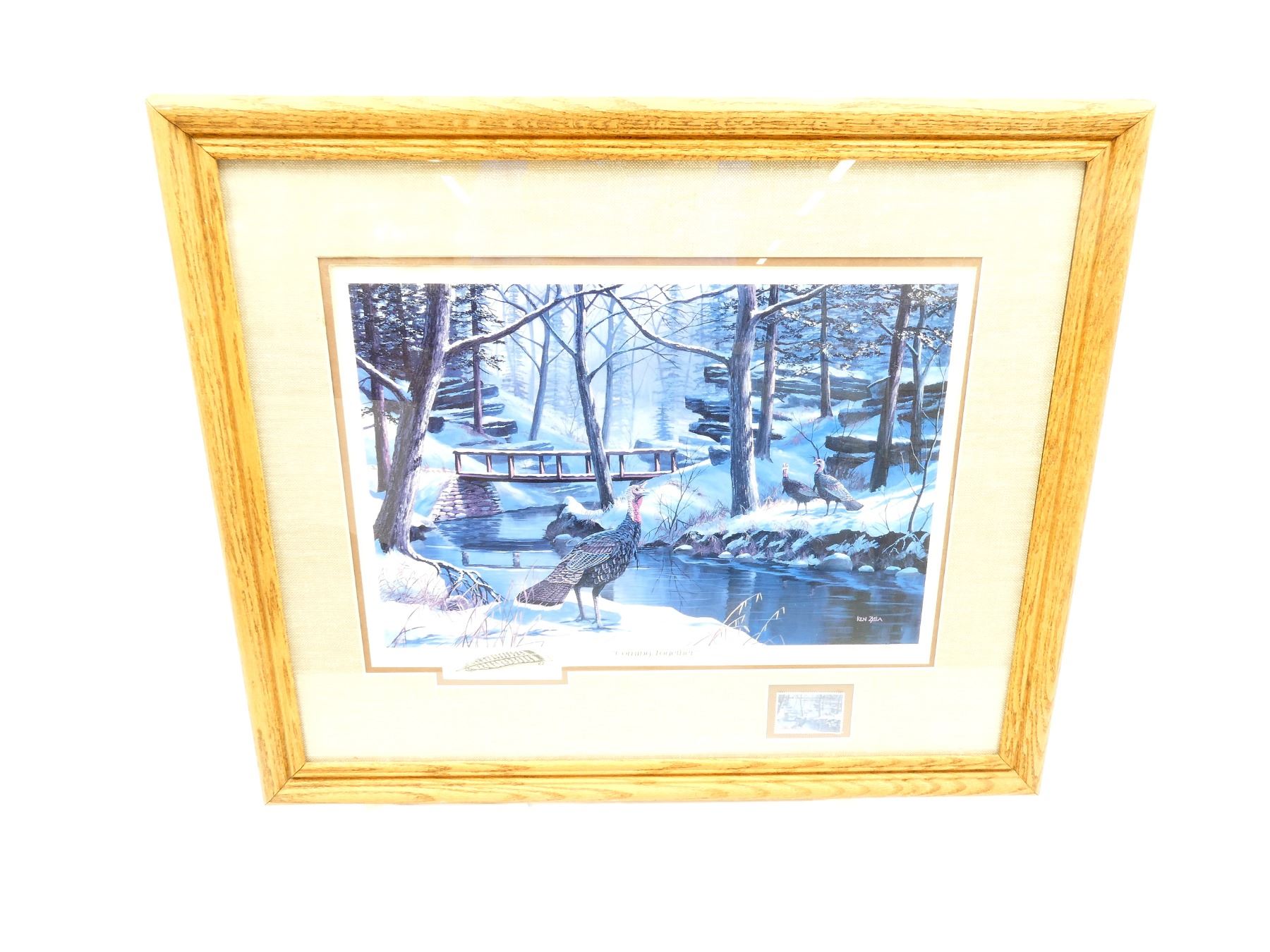 (1) BY KEN ZYLLA, WITH NORTH AMERICAN GAME BIRD SERIES STAMP, DATED 1985, WOOD FRAME, UNDER GLASS, APPROX. 24.25" X 20.5" X 1". SEE PHOTOS. *NO GUARANTEE ON GLASS FOR SHIPPING*