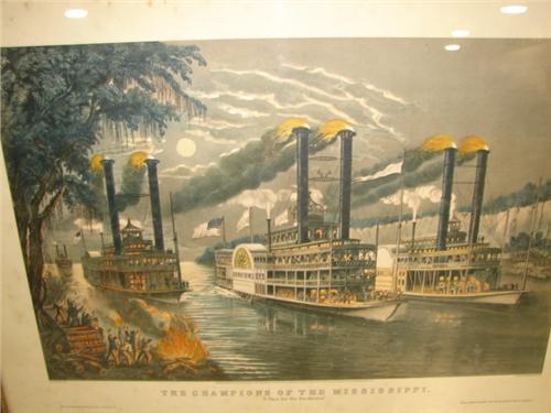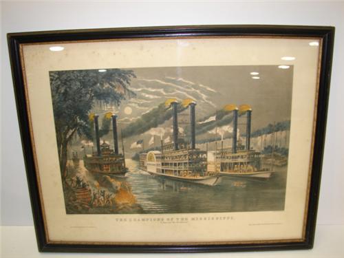 FRAMED CURRIER & IVES STEAMBOAT PRINT. “The Champions of the Mississippi/A Race for the Buckhorns”. 25.25” x 19.25” framed