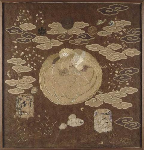 FRAMED EARLY ORIENTAL NEEDLEWORK PANEL. 18h/19th Century. Square panel has a stork decorated center with outlying lily pads with flowers. Two barrels have writing in which most has been damaged. The needlework is done in silk and other fabrics with some metal thread. PROVENANCE: From a fine Brunswick, Maine Estate. SIGHT SIZE: 36” x 34-1/2”. CONDITION: Some deterioration in written areas and some loss. 9-27496