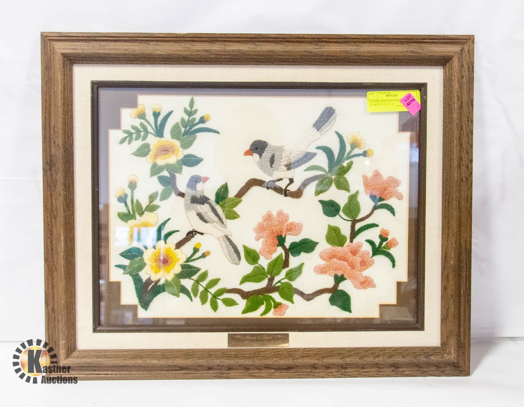 FRAMED EMBROIDERED BIRDS & FLOWERS- 21" X 16"