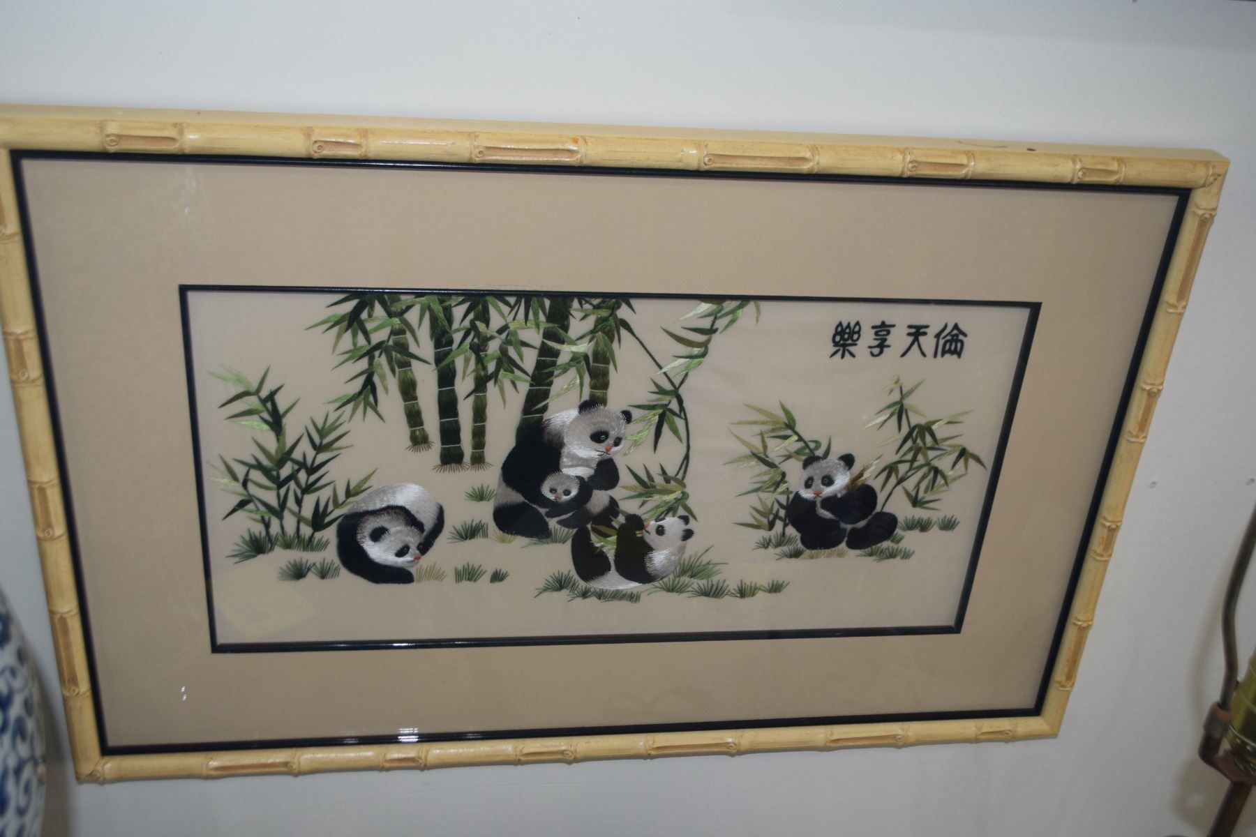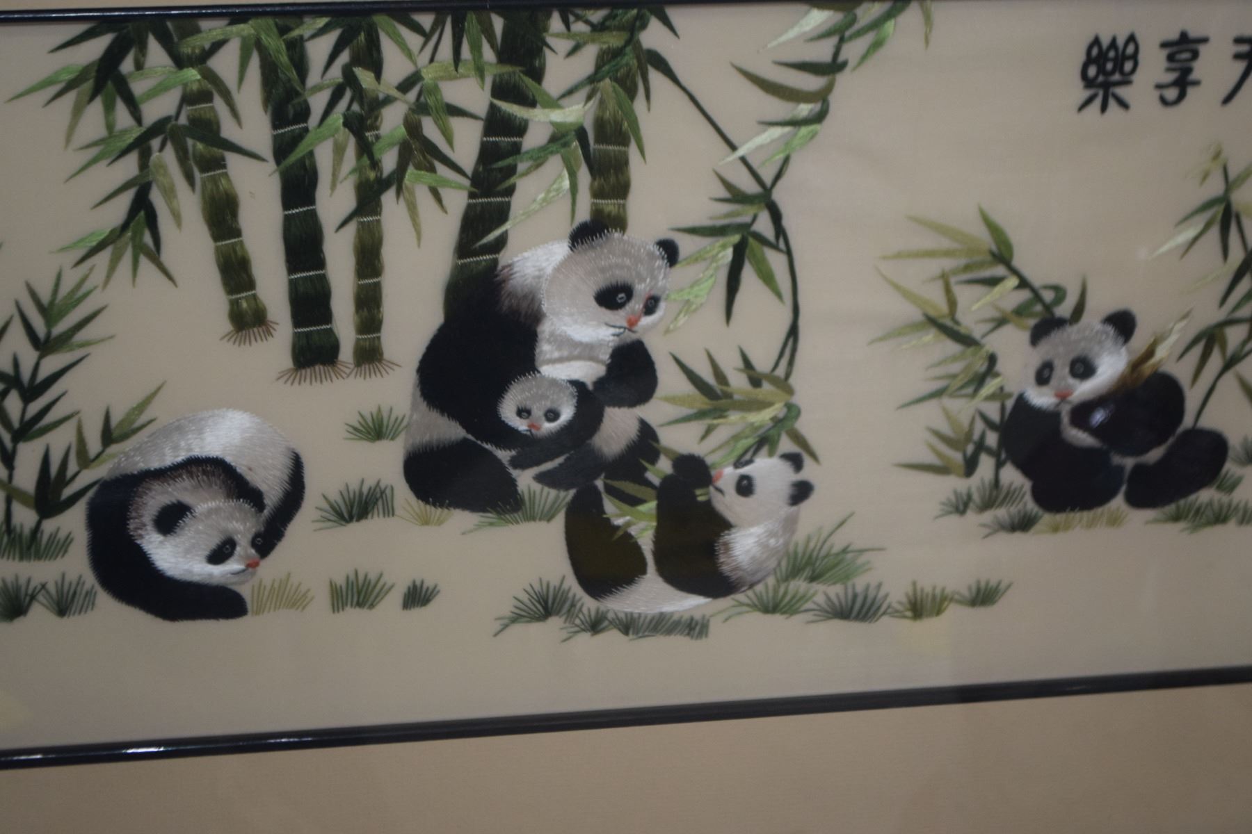 FRAMED EMBROIDERY, PANDAS (26" X 16 1/2")