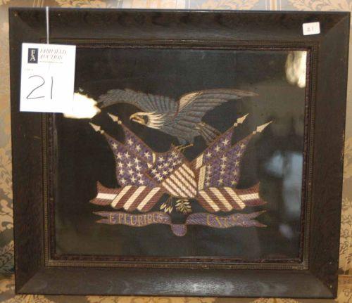 "FRAMED EXPORT EMBROIDERY OF AN EAGLE, ""E Pluribus Unum"" 12""x14"", late 19th century, excellent packing and shipping (excluding insurance) $30"